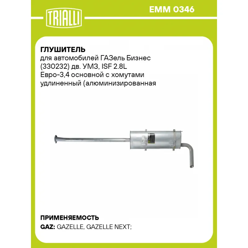 Глушитель для автомобилей ГАЗель Бизнес (330232) дв. УМЗ, ISF 2.8L Евро-3,4 основной с хомутами удлиненный (алюминизированная сталь) Характеристики: Артикул: EMM 0346 OEM номера: 330232-1201008-20, 03302-32-1201008-020 Особенности конструкции:: Шумопоглощающая набивка E-GLASS Гарантийный срок: 2 года/60 тыс. Количество на автомо... Читать полностью →