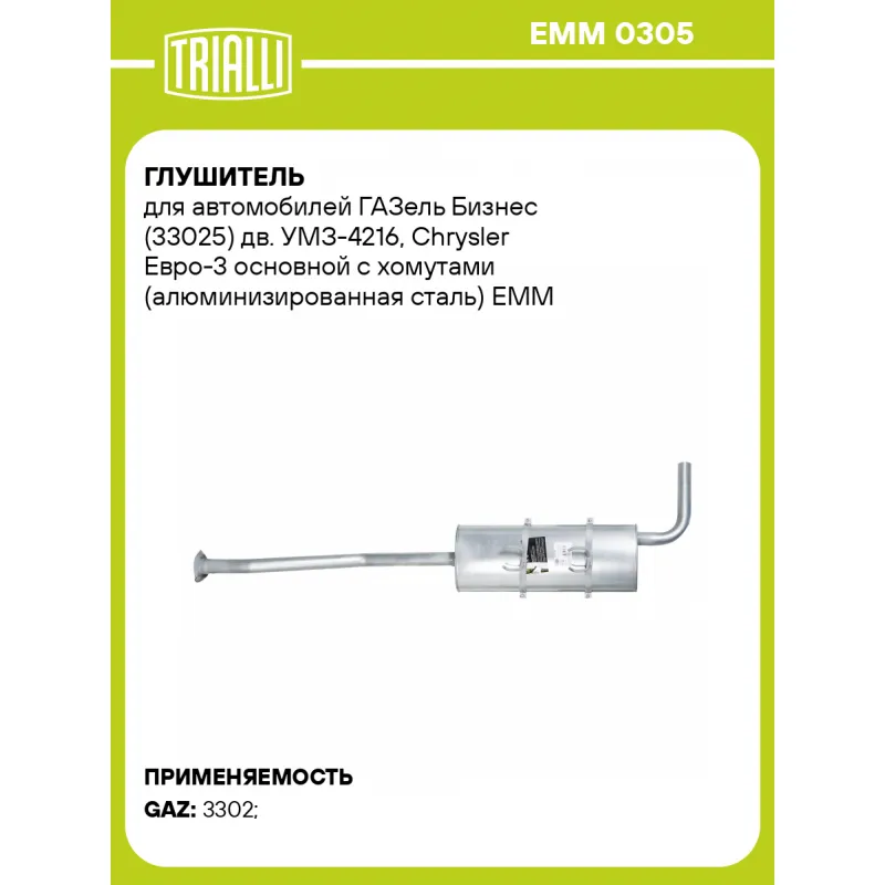 Глушитель для автомобилей ГАЗель Бизнес (33025) дв. УМЗ-4216, Chrysler Евро-3 основной с хомутами (алюминизированная сталь) Характеристики: Артикул: EMM 0305 OEM номера: 3302-1201008-20, 3302-0-1201008-20 Особенности конструкции:: Шумопоглощающая набивка E-GLASS Гарантийный срок: 2 года/60 тыс. Количество на автомобиль: 1 Камеры корпуса: 3 Материал: Алюминизированная сталь Длина изделия (мм): 1990 Длина корпуса камеры (мм): 740 Форма изделия: Овал Диаметр перфор. трубы (мм): 63.5 Диаметр корпуса D-1 (мм): 292 Диаметр корпуса D-2 (мм): 180 Товарная линейка: BLACK Дополнительная информация: Этикетка изделия может отличаться от представленной на фото Подходит для авто: ГАЗ 3302, 3302 Для проверки применяемости отправьте VIN автомобиля через вкладку "Есть вопросы о товаре?" Комплектация: Глушитель основной - 1 шт Хомут - 2 шт Гарантия: от 1 года.