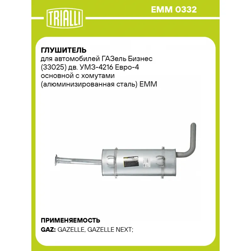 Глушитель для автомобилей ГАЗель Бизнес (33025) дв. УМЗ-4216 Евро-4 основной с хомутами (алюминизированная сталь) Характеристики: Артикул: EMM 0332 OEM номера: 3302-1201008-40, 3302-0-1201008-40, 03302-00-1201008-040 Особенности конструкции:: Шумопоглощающая набивка E-GLASS Гарантийный срок: 2 года/60 тыс. Количество на автомобиль: 1 Камеры корпуса: 3 Материал: Алюминизированная сталь Длина изделия (мм): 1470 Длина корпуса камеры (мм): 740 Форма изделия: Овал Диаметр перфор. трубы (мм): 63.5 Диаметр корпуса D-1 (мм): 272 Диаметр корпуса D-2 (мм): 177 Товарная линейка: BLACK Дополнительная информация: Этикетка изделия может отличаться от представленной на фото Комплектация: Глушитель основной - 1 шт Хомут - 2 шт Гарантия: от 1 года.