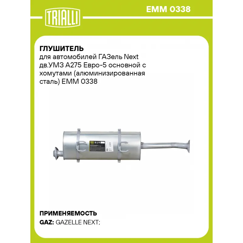 Глушитель для автомобилей ГАЗель Next дв.УМЗ А275 Евро-5 основной с хомутами (алюминизированная сталь) Характеристики: Артикул: EMM 0338 OEM номера: 2123-1201008-30 Особенности конструкции:: Шумопоглощающая набивка E-GLASS Гарантийный срок: 2 года/60 тыс. Количество на автомобиль: 1 Камеры корпуса: 3 Материал: Алюминизированная сталь Длина изделия (мм): 1320 Длина корпуса камеры (мм): 740 Форма изделия: Овал Диаметр корпуса D-1 (мм): 280 Диаметр корпуса D-2 (мм): 165 Товарная линейка: BLACK Дополнительная информация: Этикетка изделия может отличаться от представленной на фото Комплектация: Глушитель основной - 1 шт Хомут - 2 шт Гарантия: от 1 года.