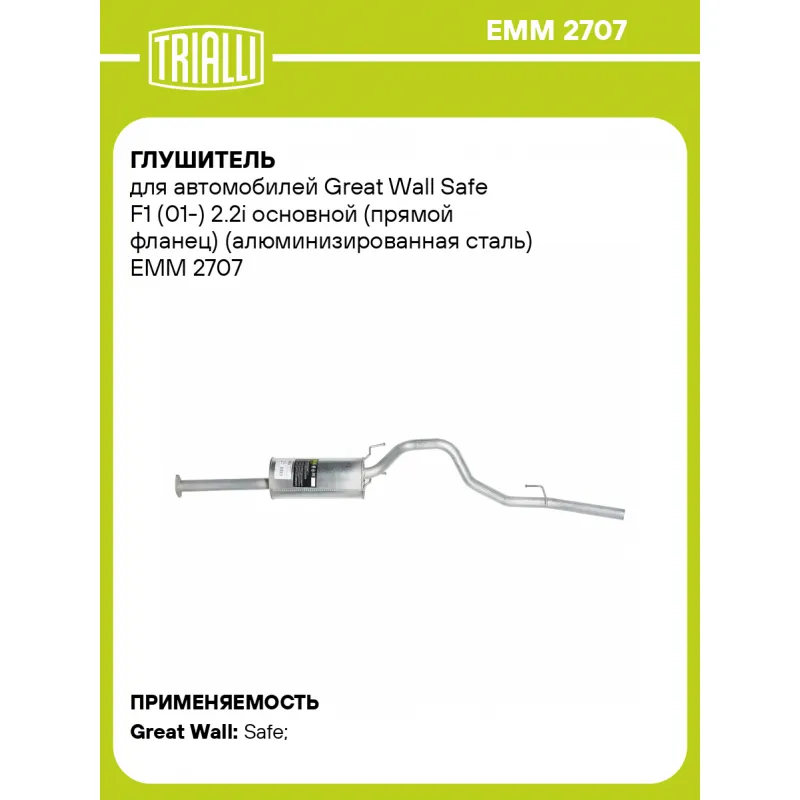 Глушитель для автомобилей Great Wall Safe F1 (01-) 2.2i основной (прямой фланец) (алюминизированная сталь) Характеристики: Артикул: EMM 2707 OEM номера: 1201010F00 Количество на автомобиль: 1 Камеры корпуса: 3 Материал: Алюминизированная сталь Гарантийный срок: 2 года/60 тыс. Особенности конструкции:: Шумопоглощающая набивка E-GLASS Длина изделия (мм): 1990 Длина корпуса камеры (мм): 400 Форма изделия: Круг Диаметр перфор. трубы (мм): 51 Диаметр корпуса D-1 (мм): 190 Товарная линейка: BLACK Дополнительная информация: Этикетка изделия может отличаться от представленной на фото Подходит для авто: Great Wall Safe (01-) Для проверки применяемости отправьте VIN автомобиля через вкладку "Есть вопросы о товаре?" Комплектация: Глушитель основной - 1 шт Гарантия: от 1 года.