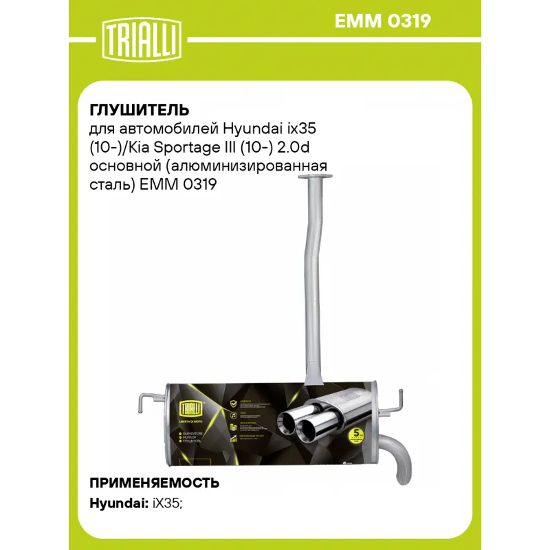 Глушитель для автомобилей Hyundai ix35 (10-)/Kia Sportage III (10-) 2.0d основной (алюминизированная сталь) Характеристики: Артикул: EMM 0319 OEM номера: 287002Y300 Количество на автомобиль: 1 Камеры корпуса: 3 Материал: Алюминизированная сталь Гарантийный срок: 2 года/60 тыс. Особенности конструкции:: Шумопоглощающая набивка E-GLASS Длина изделия (мм): 1060 Длина корпуса камеры (мм): 710 Форма изделия: Овал Диаметр перфор. трубы (мм): 51 Диаметр корпуса D-1 (мм): 280 Диаметр корпуса D-2 (мм): 165 Товарная линейка: BLACK Дополнительная информация: Этикетка изделия может отличаться от представленной на фото Подходит для авто: Hyundai iX35 (10-) Для проверки применяемости отправьте VIN автомобиля через вкладку "Есть вопросы о товаре?" Комплектация: Глушитель основной - 1 шт Гарантия: от 1 года.