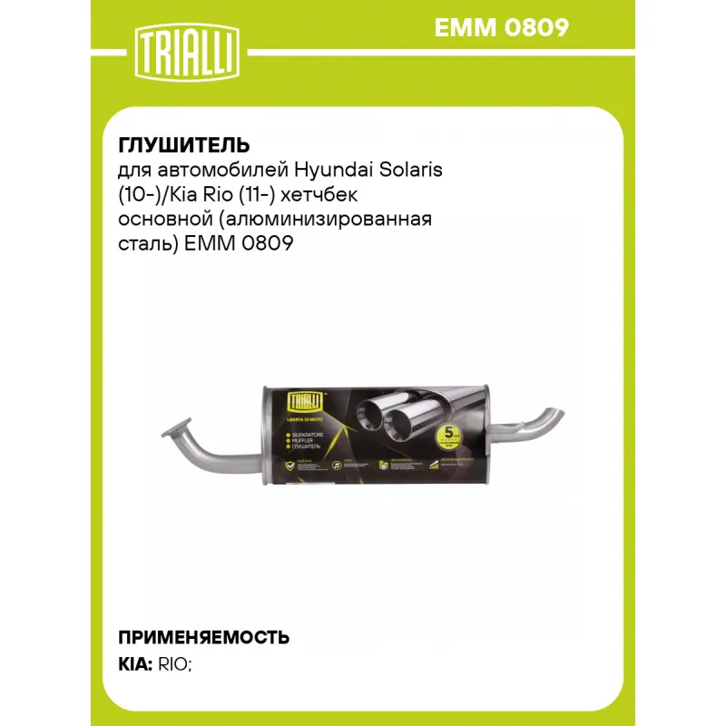 Глушитель для автомобилей Hyundai Solaris (10-)/Kia Rio (11-) хетчбек основной (алюминизированная сталь) Характеристики: Артикул: EMM 0809 OEM номера: 287104L050, 287104Y050 Количество на автомобиль: 1 Камеры корпуса: 3 Материал: Алюминизированная сталь Гарантийный срок: 2 года/60 тыс. Особенности конструкции:: Шумопоглощающая набивка E-GLASS Длина изделия (мм): 885 Длина корпуса камеры (мм): 485 Форма изделия: Овал Диаметр перфор. трубы (мм): 45 Диаметр корпуса D-1 (мм): 221 Диаметр корпуса D-2 (мм): 131 Товарная линейка: BLACK Дополнительная информация: Этикетка изделия может отличаться от представленной на фото Сопутствующий товар: Трубы газоприемные: ERP 0801 Комплектация: Глушитель основной - 1 шт Гарантия: от 1 года.