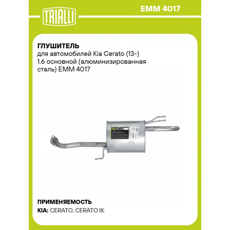 Глушитель для автомобилей Kia Cerato (13-) 1.6 основной (алюминизированная сталь) Характеристики: Артикул: EMM 4017 OEM номера: 28710A7200 Особенности конструкции:: Шумопоглощающая набивка E-Glass Гарантийный срок: 2 года/60 тыс. Количество на автомобиль: 1 Камеры корпуса: 3 Материал: Алюминизированная сталь Длина изделия (мм): ... Читать полностью →