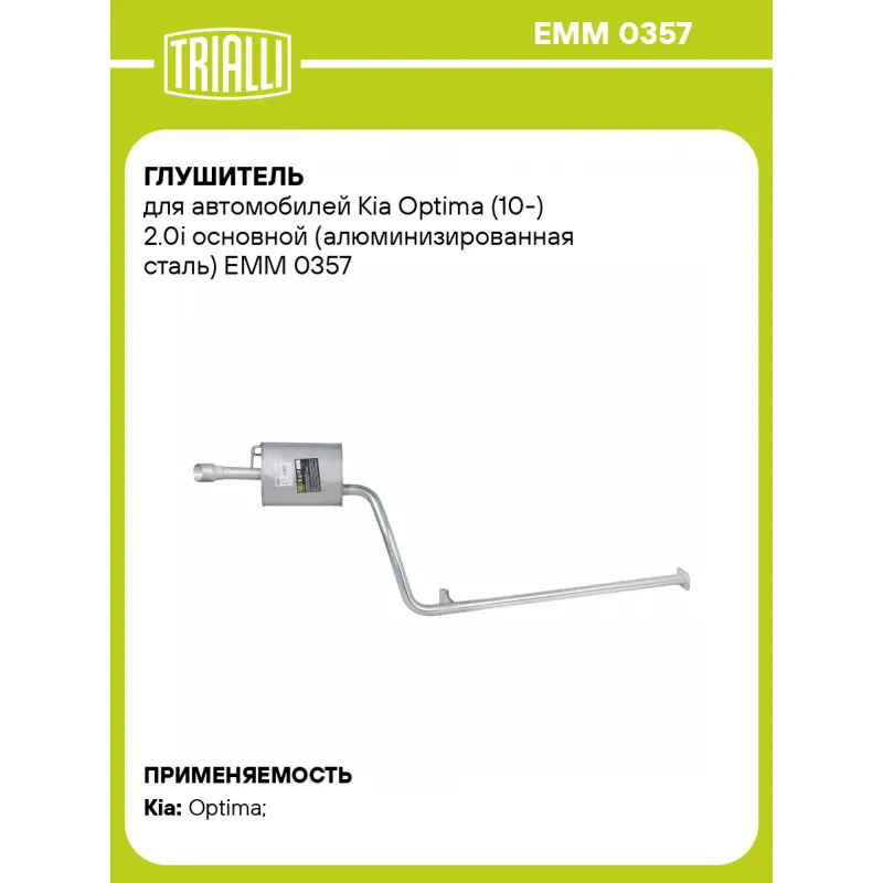 Глушитель для автомобилей Kia Optima (10-) 2.0i основной (алюминизированная сталь) Характеристики: Артикул: EMM 0357 OEM номера: 287102T110 Количество на автомобиль: 1 Камеры корпуса: 3 Материал: Алюминизированная сталь Гарантийный срок: 2 года/60 тыс. Особенности конструкции:: Шумопоглощающая набивка E-GLASS Длина изделия (мм): 2220 Длина корпуса камеры (мм): 415 Форма изделия: Овал Диаметр перфор. трубы (мм): 51 Диаметр корпуса D-1 (мм): 280 Диаметр корпуса D-2 (мм): 165 Товарная линейка: BLACK Дополнительная информация: Этикетка изделия может отличаться от представленной на фото Подходит для авто: Kia Optima (11-) Для проверки применяемости отправьте VIN автомобиля через вкладку "Есть вопросы о товаре?" Комплектация: Глушитель основной - 1 шт Гарантия: от 1 года.