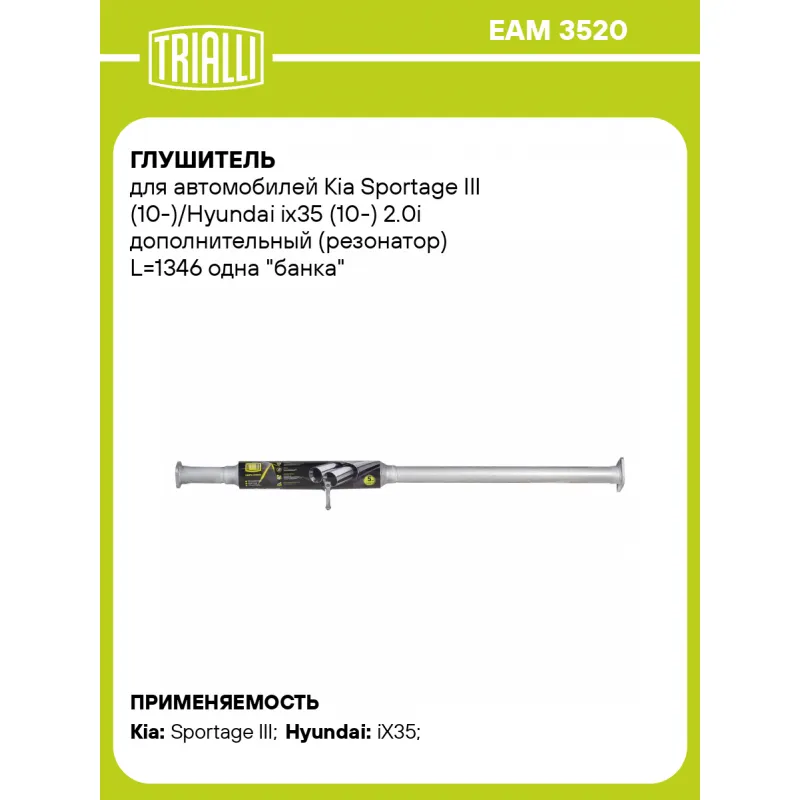 Глушитель для автомобилей Kia Sportage III (10-)/Hyundai ix35 (10-) 2.0i дополнительный (резонатор) L=1346 одна "банка" (алюминизированная сталь) Характеристики: Артикул: EAM 3520 OEM номера: 286502S100 Количество на автомобиль: 1 Камеры корпуса: 1 Материал: Алюминизированная сталь Гарантийный срок: 2 года/60 тыс. Особенности конструкции:: Шумопоглощающая набивка E-GLASS Длина изделия (мм): 1346 Длина корпуса камеры (мм): 500 Форма изделия: Круг Диаметр перфор. трубы (мм): 51 Диаметр корпуса D-1 (мм): 83 Товарная линейка: BLACK Дополнительная информация: Этикетка изделия может отличаться от представленной на фото Сопутствующий товар: Глушители основные/глушители дополнительные (резонаторы): EMM 0358 Подходит для авто: Kia Sportage III (10-) Hyundai iX35 (10-) Для проверки применяемости отправьте VIN автомобиля через вкладку "Есть вопросы о товаре?" Комплектация: Стартер - 1 шт Гарантия: от 1 года.