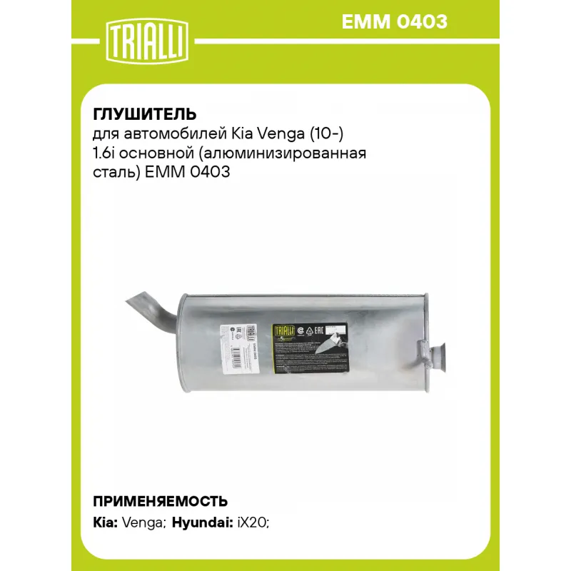 Глушитель для автомобилей Kia Venga (10-) 1.6i основной (алюминизированная сталь) Характеристики: Артикул: EMM 0403 OEM номера: 28730-1P300 Количество на автомобиль: 1 Камеры корпуса: 3 Материал: Алюминизированная сталь Гарантийный срок: 2 года/60 тыс. Особенности конструкции:: Шумопоглощающая набивка E-GLASS Длина изделия (мм): 640 Длина корпуса камеры (мм): 500 Форма изделия: Овал Диаметр перфор. трубы (мм): 45 Диаметр корпуса D-1 (мм): 200 Диаметр корпуса D-2 (мм): 170 Товарная линейка: BLACK Дополнительная информация: Этикетка изделия может отличаться от представленной на фото Сопутствующий товар: Глушители основные/глушители дополнительные (резонаторы): EAM 0403 Подходит для авто: Kia Venga (10-) Hyundai iX20 (10-) Для проверки применяемости отправьте VIN автомобиля через вкладку "Есть вопросы о товаре?" Комплектация: Глушитель основной - 1 шт Гарантия: от 1 года.