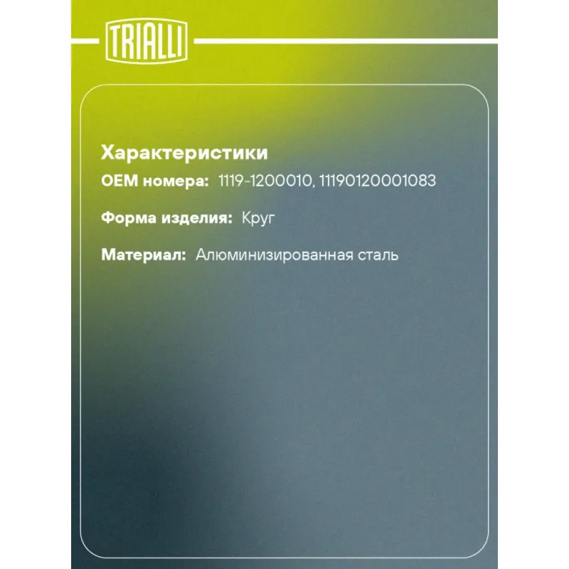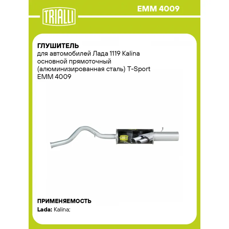 Глушитель для автомобилей Лада 1119 Kalina основной прямоточный (алюминизированная сталь) T-Sport Характеристики: Артикул: EMM 4009 OEM номера: 1119-1200010, 11190120001083 Особенности конструкции:: Шумопоглощающая набивка E-GLASS Гарантийный срок: 2 года/60 тыс. Длина изделия (мм): 1160 Длина корпуса камеры (мм): 334 Форма изделия: Круг Диаметр корпуса D-1 (мм): 138 Диаметр перфор. трубы (мм): 45 Материал: Алюминизированная сталь Товарная линейка: BLACK Дополнительная информация: Этикетка изделия может отличаться от представленной на фото Подходит для авто: ВАЗ Kalina (04-) Для проверки применяемости отправьте VIN автомобиля через вкладку "Есть вопросы о товаре?" Комплектация: Глушитель основной - 1 шт Гарантия: от 1 года.