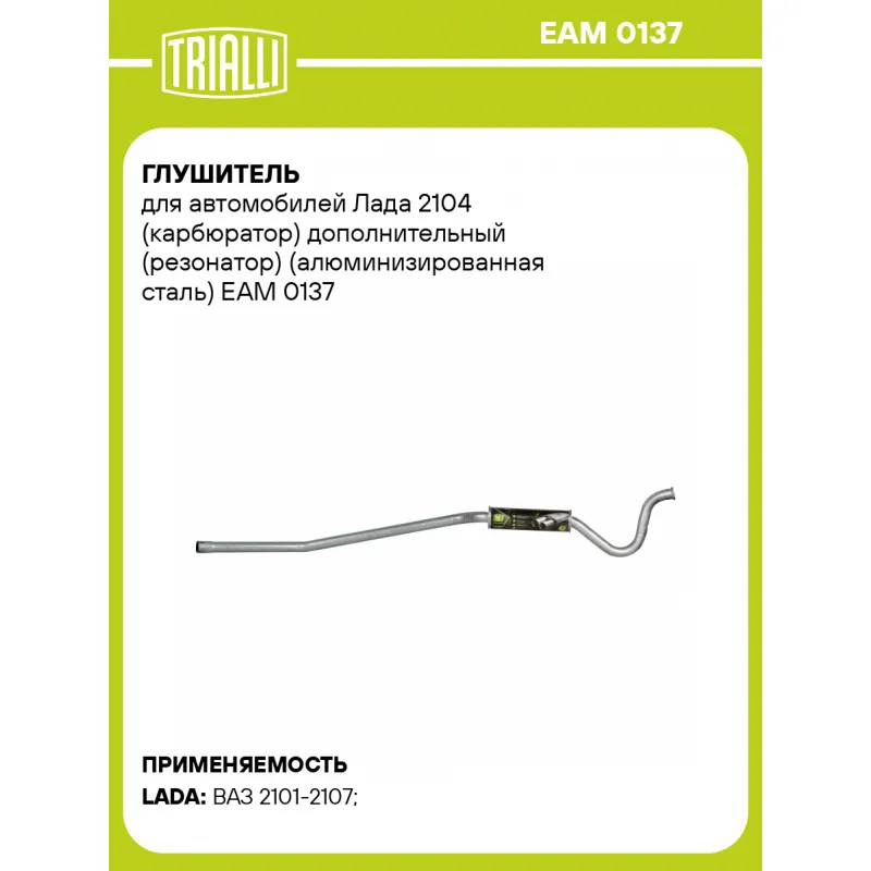 Глушитель для автомобилей Лада 2104 (карбюратор) дополнительный (резонатор) (алюминизированная сталь) Характеристики: Артикул: EAM 0137 OEM номера: 21254-1202010-20 Количество на автомобиль: 1 Камеры корпуса: 1 Материал: Алюминизированная сталь Гарантийный срок: 2 года/60 тыс. Особенности конструкции:: Шумопоглощающая набивка E-GLASS Длина изделия (мм): 1915 Длина корпуса камеры (мм): 330 Форма изделия: Круг Диаметр перфор. трубы (мм): 45 Диаметр корпуса D-1 (мм): 88 Товарная линейка: BLACK Дополнительная информация: Этикетка изделия может отличаться от представленной на фото Сопутствующий товар: Глушители основные/глушители дополнительные (резонаторы): EMM 0103, EMM 0104 Комплектация: Резонатор - 1 шт Гарантия: от 1 года.