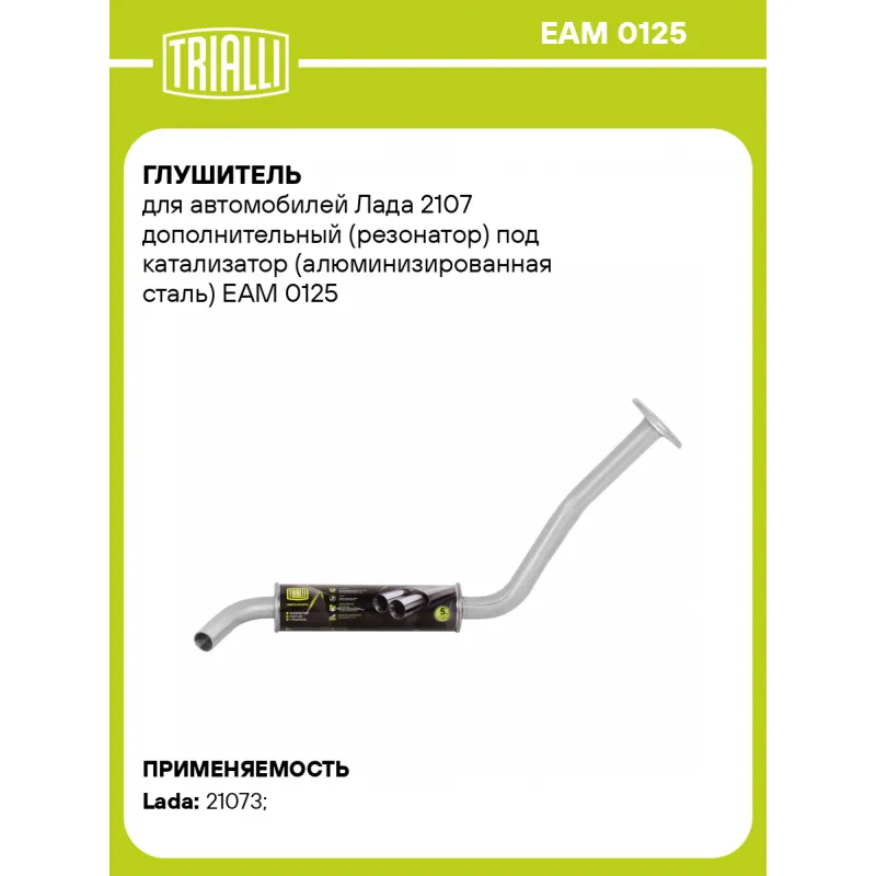Глушитель для автомобилей Лада 2107 дополнительный (резонатор) под катализатор (алюминизированная сталь) Характеристики: Артикул: EAM 0125 OEM номера: 2107-1202005 Количество на автомобиль: 1 Камеры корпуса: 1 Материал: Алюминизированная сталь Гарантийный срок: 2 года/60 тыс. Особенности конструкции:: Шумопоглощающая набивка E-GLASS Длина изделия (мм): 860 Длина корпуса камеры (мм): 330 Форма изделия: Круг Диаметр перфор. трубы (мм): 45 Диаметр корпуса D-1 (мм): 88 Товарная линейка: BLACK Дополнительная информация: Этикетка изделия может отличаться от представленной на фото Сопутствующий товар: Глушители основные/глушители дополнительные (резонаторы): EAM 0125s, EAM 0106s, EAM 0106 Сопутствующий товар: Трубы газоприемные: ERP 0102 Подходит для авто: ВАЗ 21073 Для проверки применяемости отправьте VIN автомобиля через вкладку "Есть вопросы о товаре?" Комплектация: Резонатор - 1 шт Гарантия: от 1 года.