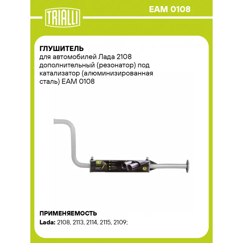 Глушитель для автомобилей Лада 2108 дополнительный (резонатор) под катализатор (алюминизированная сталь) Характеристики: Артикул: EAM 0108 OEM номера: 21082-1200020, 21082120002000, 21082120002081, 21082120002083 Количество на автомобиль: 1 Камеры корпуса: 3 Материал: Алюминизированная сталь Гарантийный срок: 2 года/60 тыс. Особенности конструкции:: Шумопоглощающая набивка E-GLASS Длина изделия (мм): 1211 Длина корпуса камеры (мм): 550 Форма изделия: Круг Диаметр перфор. трубы (мм): 45 Диаметр корпуса D-1 (мм): 101 Товарная линейка: BLACK Дополнительная информация: Этикетка изделия может отличаться от представленной на фото Сопутствующий товар: Глушители основные/глушители дополнительные (резонаторы): EAM 0107, EAM 0109s, EAM 0108s Сопутствующий товар: Трубы газоприемные: ECP 0103; ECP 0113; ERP 0103 Подходит для авто: ВАЗ 2108, 2113, 2114, 2115, 2109 Для проверки применяемости отправьте VIN автомобиля через вкладку "Есть вопросы о товаре?" Комплектация: Резонатор - 1 шт Гарантия: от 1 года.