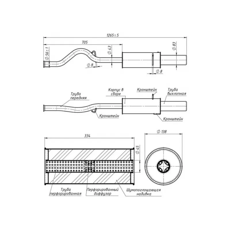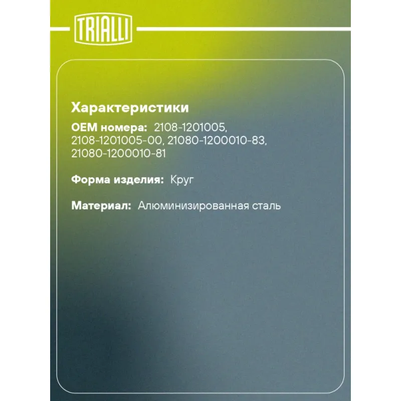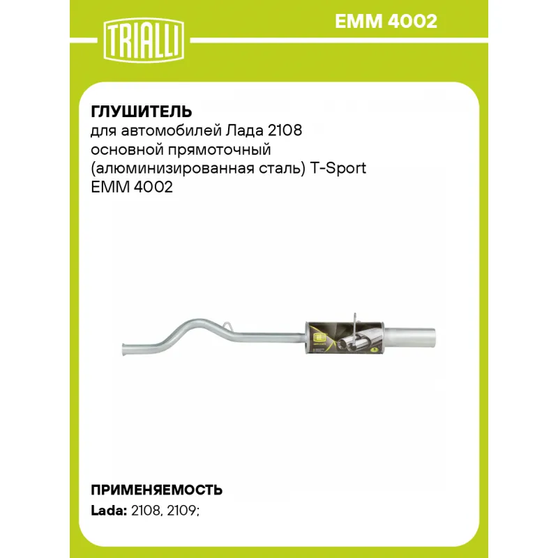 Глушитель для автомобилей Лада 2108 основной прямоточный (алюминизированная сталь) T-Sport Характеристики: Артикул: EMM 4002 OEM номера: 2108-1201005, 2108-1201005-00, 21080-1200010-83, 21080-1200010-81 Особенности конструкции:: Шумопоглощающая набивка E-GLASS Гарантийный срок: 2 года/60 тыс. Длина изделия (мм): 1265 Длина корпуса камеры (мм): 334 Форма изделия: Круг Диаметр корпуса D-1 (мм): 138 Диаметр перфор. трубы (мм): 45 Материал: Алюминизированная сталь Товарная линейка: BLACK Дополнительная информация: Этикетка изделия может отличаться от представленной на фото Подходит для авто: ВАЗ 2108, 2109, 2108, 2109 Для проверки применяемости отправьте VIN автомобиля через вкладку "Есть вопросы о товаре?" Комплектация: Глушитель основной - 1 шт Гарантия: от 1 года.