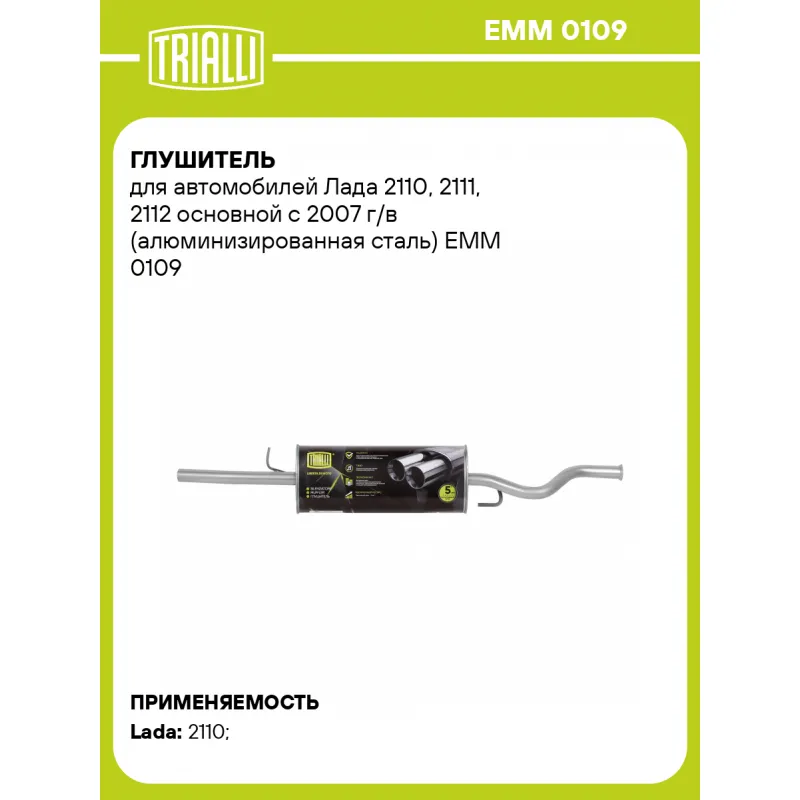 Глушитель для автомобилей Лада 2110, 2111, 2112 основной с 2007 г/в (алюминизированная сталь) Характеристики: Артикул: EMM 0109 OEM номера: 21100-1200010-20, 21100-1200011-81, 21100-1200011-83 Сопутсвующий товар: Хомут: TCLP 45 Количество на автомобиль: 1 Камеры корпуса: 3 Материал: Алюминизированная сталь Гарантийный срок: 2 года/60 тыс. Особенности конструкции:: Шумопоглощающая набивка E-GLASS Длина изделия (мм): 1460 Длина корпуса камеры (мм): 544 Форма изделия: Овал Диаметр перфор. трубы (мм): 45 Диаметр корпуса D-1 (мм): 221 Диаметр корпуса D-2 (мм): 131 Товарная линейка: BLACK Дополнительная информация: Этикетка изделия может отличаться от представленной на фото Подходит для авто: ВАЗ 2110 Для проверки применяемости отправьте VIN автомобиля через вкладку "Есть вопросы о товаре?" Комплектация: Глушитель основной - 1 шт Гарантия: от 1 года.