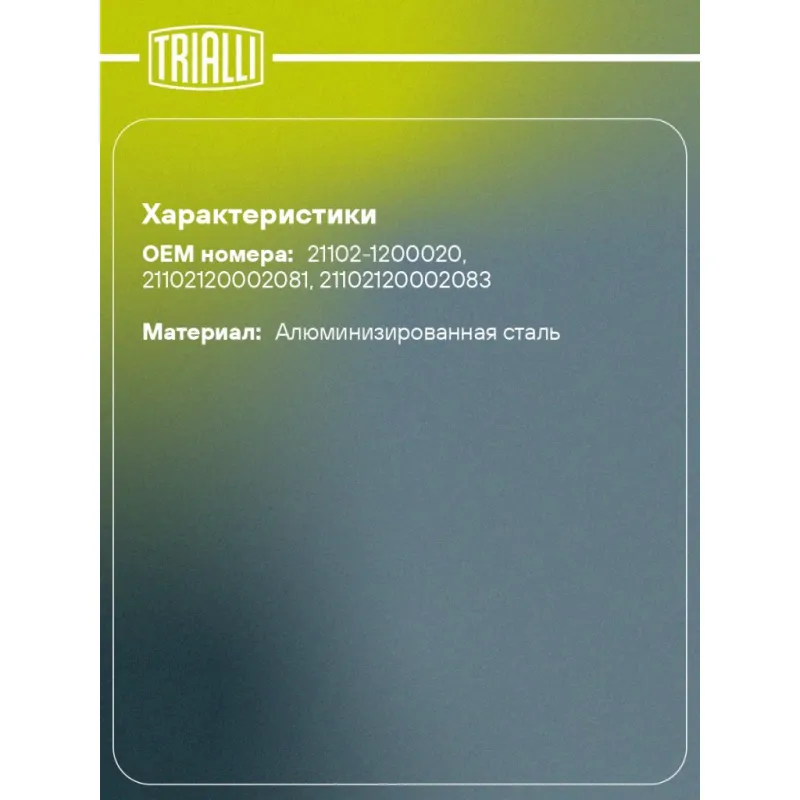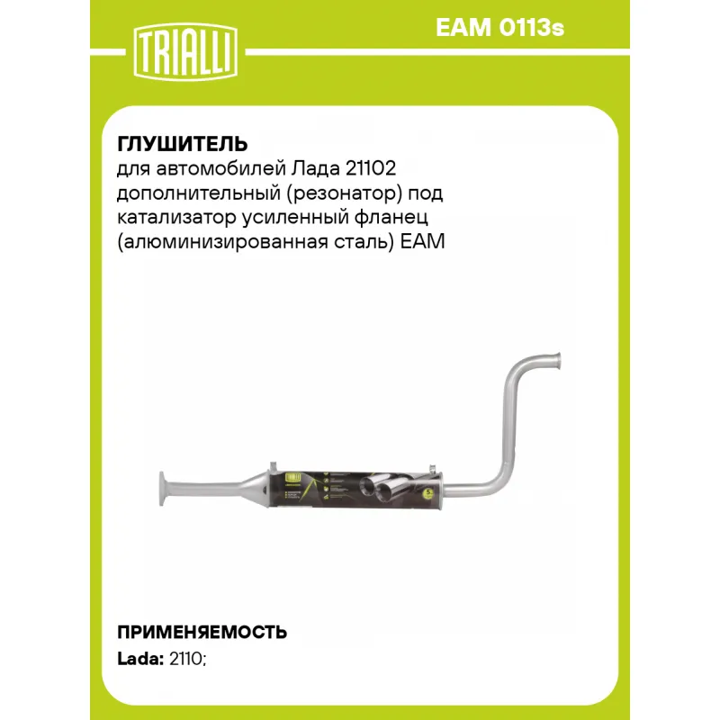 Глушитель для автомобилей Лада 21102 дополнительный (резонатор) под катализатор усиленный фланец (алюминизированная сталь) Характеристики: Артикул: EAM 0113s OEM номера: 21102-1200020, 21102120002081, 21102120002083 Количество на автомобиль: 1 Камеры корпуса: 3 Материал: Алюминизированная сталь Гарантийный срок: 2 года/60 тыс. Особенности конструкции:: Шумопоглощающая набивка E-GLASS Длина изделия (мм): 1241 Длина корпуса камеры (мм): 540 Форма изделия: Овал Диаметр перфор. трубы (мм): 45 Диаметр корпуса D-1 (мм): 120 Диаметр корпуса D-2 (мм): 87 Товарная линейка: BLACK Дополнительная информация: Этикетка изделия может отличаться от представленной на фото Сопутствующий товар: Глушители основные/глушители дополнительные (резонаторы): EAM 0113 Сопутствующий товар: Трубы газоприемные: ECP 0103; ECP 0109; ECP 0113; ERP 0104 Подходит для авто: ВАЗ 2110 Для проверки применяемости отправьте VIN автомобиля через вкладку "Есть вопросы о товаре?" Комплектация: Резонатор - 1 шт Гарантия: от 1 года.