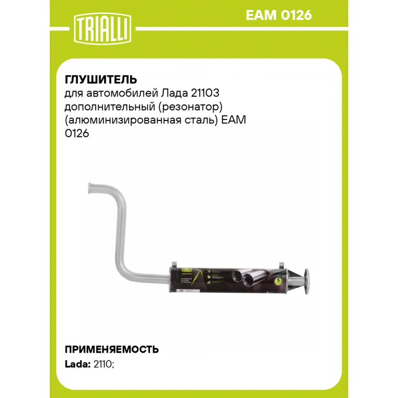 Глушитель для автомобилей Лада 21103 дополнительный (резонатор) (алюминизированная сталь) Характеристики: Артикул: EAM 0126 OEM номера: 21103-1200020, 21103120002081, 21103120002083 Количество на автомобиль: 1 Камеры корпуса: 3 Материал: Алюминизированная сталь Гарантийный срок: 2 года/60 тыс. Особенности конструкции:: Шумопоглощающая набивка E-GLASS Длина изделия (мм): 1005 Длина корпуса камеры (мм): 540 Форма изделия: Овал Диаметр перфор. трубы (мм): 45 Диаметр корпуса D-1 (мм): 120 Диаметр корпуса D-2 (мм): 87 Товарная линейка: BLACK Дополнительная информация: Этикетка изделия может отличаться от представленной на фото Сопутствующий товар: Глушители основные/глушители дополнительные (резонаторы): EAM 0126s Сопутствующий товар: Трубы газоприемные: ECP 0103; ECP 0109; ECP 0113; ERP 0104 Подходит для авто: ВАЗ 2110 Для проверки применяемости отправьте VIN автомобиля через вкладку "Есть вопросы о товаре?" Комплектация: Резонатор - 1 шт Гарантия: от 1 года.