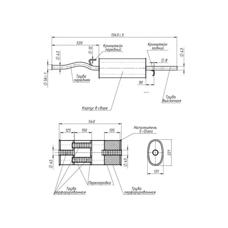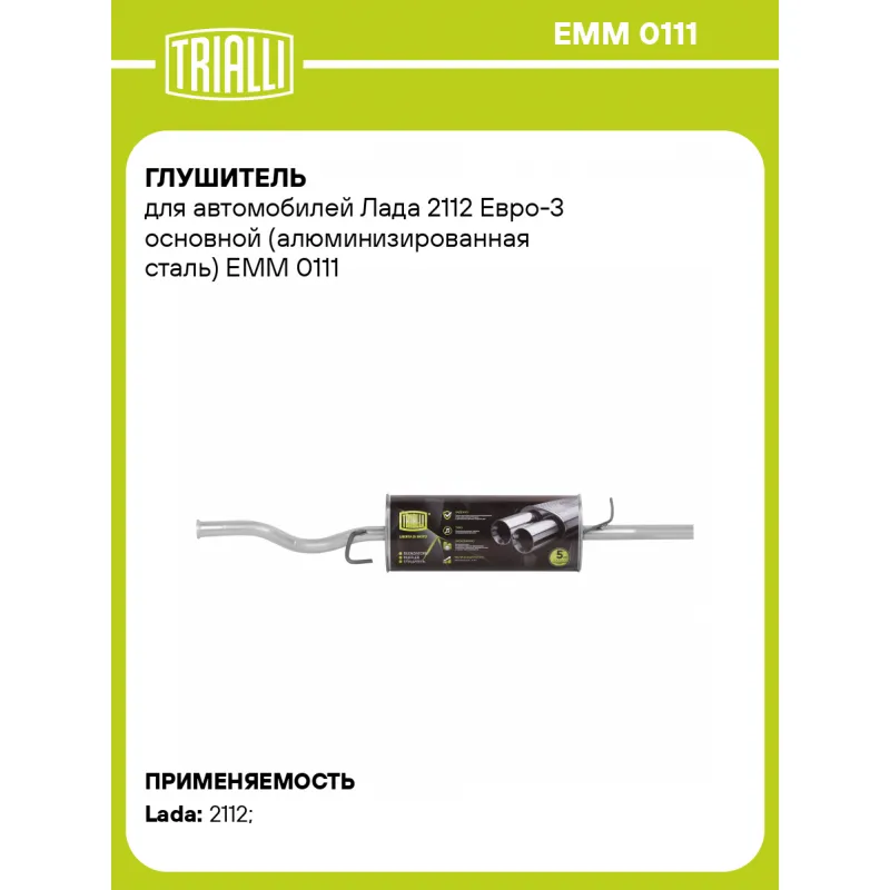 Глушитель для автомобилей Лада 2112 Евро-3 основной (алюминизированная сталь) Характеристики: Артикул: EMM 0111 OEM номера: 21120-1200010-20, 21120-1200011-81, 21120-1200011-83 Количество на автомобиль: 1 Камеры корпуса: 3 Материал: Алюминизированная сталь Гарантийный срок: 2 года/60 тыс. Особенности конструкции:: Шумопоглощающая набивка E-GLASS Длина изделия (мм): 1345 Длина корпуса камеры (мм): 540 Форма изделия: Овал Диаметр перфор. трубы (мм): 45 Диаметр корпуса D-1 (мм): 221 Диаметр корпуса D-2 (мм): 131 Товарная линейка: BLACK Дополнительная информация: Этикетка изделия может отличаться от представленной на фото Подходит для авто: ВАЗ 2112 Для проверки применяемости отправьте VIN автомобиля через вкладку "Есть вопросы о товаре?" Комплектация: Глушитель основной - 1 шт Гарантия: от 1 года.