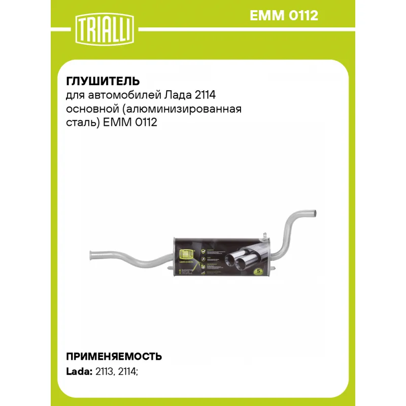 Глушитель для автомобилей Лада 2114 основной (алюминизированная сталь) Характеристики: Артикул: EMM 0112 OEM номера: 21140-1201005, 21140-1200010-81, 21130-1201005-00, 21130-1200010-82, 21140-1200010-83 Количество на автомобиль: 1 Камеры корпуса: 3 Материал: Алюминизированная сталь Гарантийный срок: 2 года/60 тыс. Особенности конструкции:: Шумопоглощающая набивка E-GLASS Длина изделия (мм): 1279 Длина корпуса камеры (мм): 544 Форма изделия: Овал Диаметр перфор. трубы (мм): 45 Диаметр корпуса D-1 (мм): 221 Диаметр корпуса D-2 (мм): 131 Товарная линейка: BLACK Дополнительная информация: Этикетка изделия может отличаться от представленной на фото Подходит для авто: ВАЗ 2113, 2114 Для проверки применяемости отправьте VIN автомобиля через вкладку "Есть вопросы о товаре?" Комплектация: Глушитель основной - 1 шт Гарантия: от 1 года.