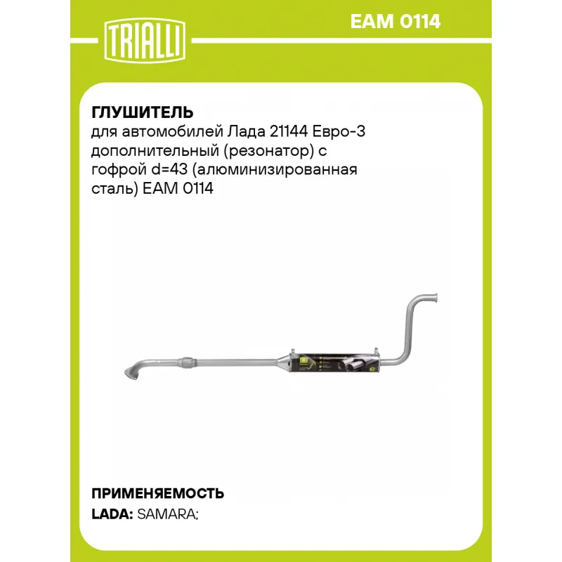 Глушитель для автомобилей Лада 21144 Евро-3 дополнительный (резонатор) с гофрой d=43 (алюминизированная сталь) Характеристики: Артикул: EAM 0114 OEM номера: 21144120002081, 21144120002083, 21144-1200020-02, 21144-1200020-00 Количество на автомобиль: 1 Камеры корпуса: 3 Материал: Алюминизированная сталь Гарантийный срок: 2 года/60 тыс. Особенности конструкции:: Шумопоглощающая набивка E-GLASS Длина изделия (мм): 1860 Длина корпуса камеры (мм): 550 Форма изделия: Круг Диаметр перфор. трубы (мм): 45 Диаметр корпуса D-1 (мм): 101 Товарная линейка: BLACK Дополнительная информация: Этикетка изделия может отличаться от представленной на фото Комплектация: Резонатор с виброкомпенсатором - 1 шт Гарантия: от 1 года.