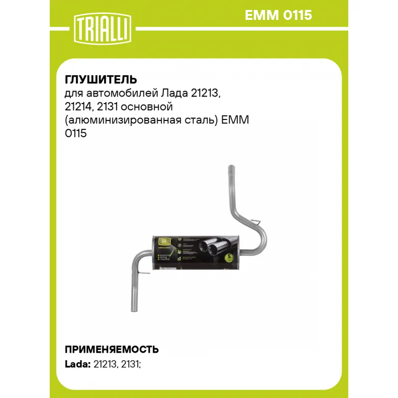 Глушитель для автомобилей Лада 21213, 21214, 2131 основной (алюминизированная сталь) Характеристики: Артикул: EMM 0115 OEM номера: 21213-1200010, 212141200010, 21214120001081, 21214120001083, 21214-1200010-00, 21214-1200010-02, 21214-1200010-10, 21213-1203016-01 Количество на автомобиль: 1 Камеры корпуса: 3 Материал: Алюминизированная сталь Гарантийный срок: 2 года/60 тыс. Особенности конструкции:: Шумопоглощающая набивка E-GLASS Длина изделия (мм): 910 Длина корпуса камеры (мм): 544 Форма изделия: Овал Диаметр перфор. трубы (мм): 45 Диаметр корпуса D-1 (мм): 221 Диаметр корпуса D-2 (мм): 131 Товарная линейка: BLACK Дополнительная информация: Этикетка изделия может отличаться от представленной на фото Сопутствующий товар: Трубы газоприемные: ERP 0109 Подходит для авто: ВАЗ 21213, 2131 Для проверки применяемости отправьте VIN автомобиля через вкладку "Есть вопросы о товаре?" Комплектация: Глушитель основной - 1 шт Гарантия: от 1 года.