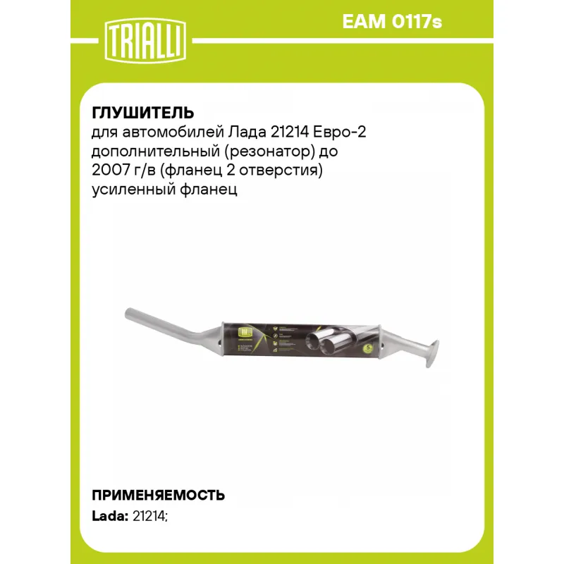 Глушитель для автомобилей Лада 21214 Евро-2 дополнительный (резонатор) до 2007 г/в (фланец 2 отверстия) усиленный фланец (алюминизированная сталь) Характеристики: Артикул: EAM 0117s OEM номера: 21214-1200020-00, 21214-1200020-11 Количество на автомобиль: 1 Камеры корпуса: 3 Материал: Алюминизированная сталь Гарантийный срок: 2 года/60 тыс. Особенности конструкции:: Шумопоглощающая набивка E-GLASS Длина изделия (мм): 1110 Длина корпуса камеры (мм): 540 Форма изделия: Овал Диаметр перфор. трубы (мм): 45 Диаметр корпуса D-1 (мм): 120 Диаметр корпуса D-2 (мм): 87 Товарная линейка: BLACK Дополнительная информация: Этикетка изделия может отличаться от представленной на фото Сопутствующий товар: Глушители основные/глушители дополнительные (резонаторы): EAM 0117, EAM 0118 Подходит для авто: ВАЗ 21214 Для проверки применяемости отправьте VIN автомобиля через вкладку "Есть вопросы о товаре?" Комплектация: Резонатор - 1 шт Гарантия: от 1 года.