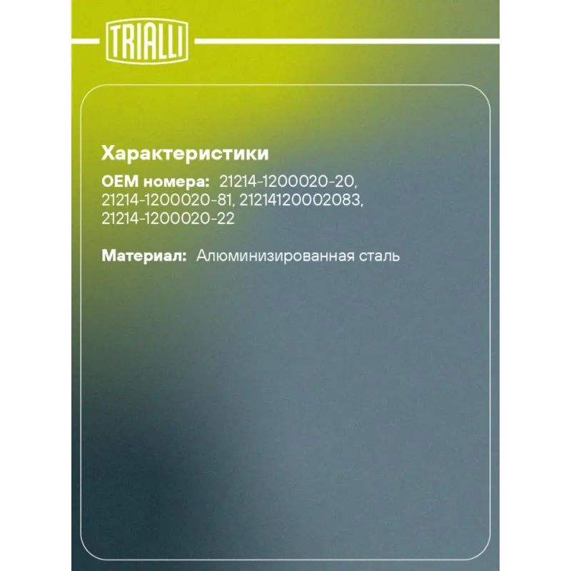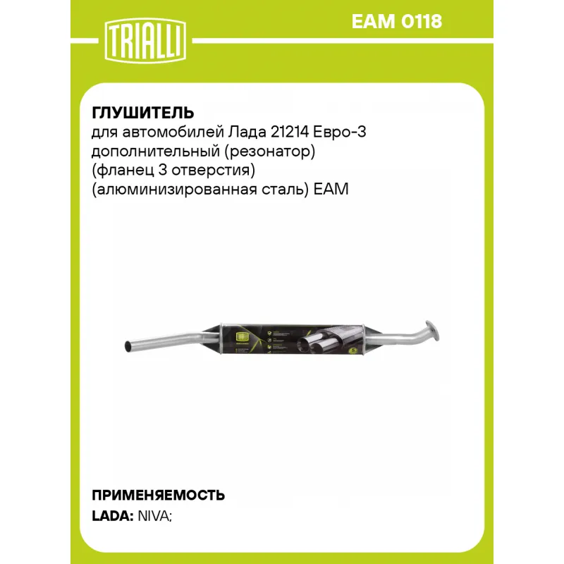 Глушитель для автомобилей Лада 21214 Евро-3 дополнительный (резонатор) (фланец 3 отверстия) (алюминизированная сталь) Характеристики: Артикул: EAM 0118 OEM номера: 21214-1200020-20, 21214-1200020-81, 21214120002083, 21214-1200020-22 Количество на автомобиль: 1 Камеры корпуса: 3 Материал: Алюминизированная сталь Гарантийный срок: 2 года/60 тыс. Особенности конструкции:: Шумопоглощающая набивка E-GLASS Длина изделия (мм): 1160 Длина корпуса камеры (мм): 550 Форма изделия: Круг Диаметр перфор. трубы (мм): 45 Диаметр корпуса D-1 (мм): 101 Товарная линейка: BLACK Дополнительная информация: Этикетка изделия может отличаться от представленной на фото Сопутствующий товар: Глушители основные/глушители дополнительные (резонаторы): EAM 0117s, EAM 0117 Комплектация: Резонатор - 1 шт Гарантия: от 1 года.