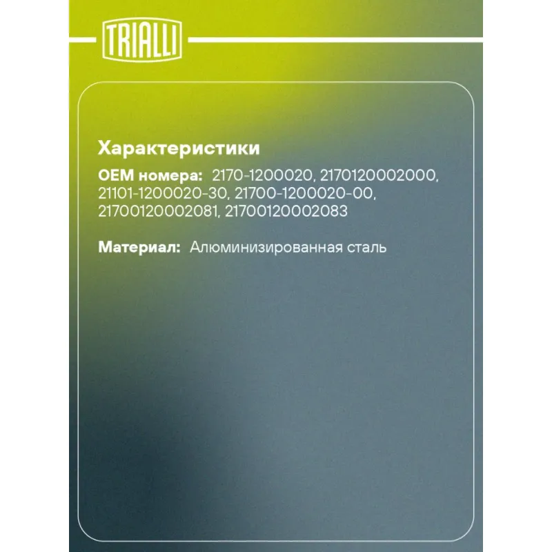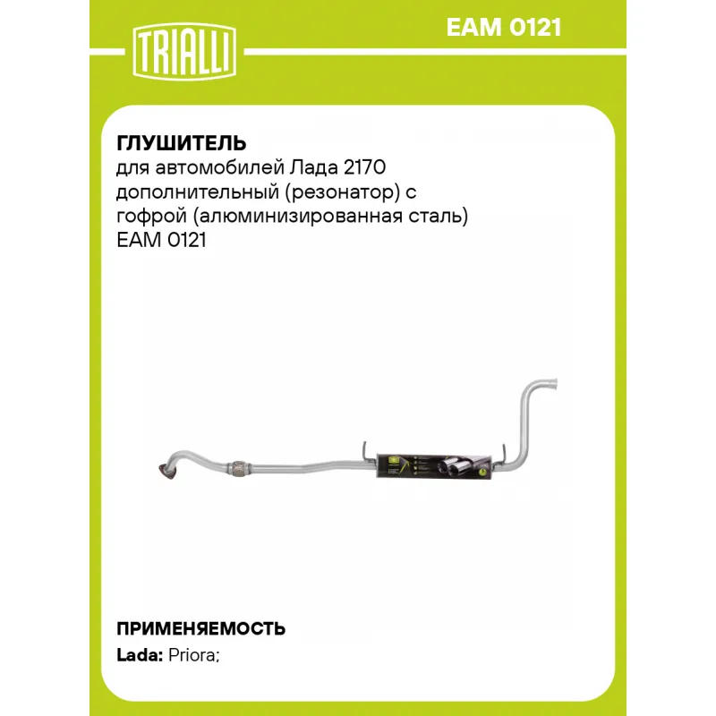 Глушитель для автомобилей Лада 2170 дополнительный (резонатор) с гофрой (алюминизированная сталь) Характеристики: Артикул: EAM 0121 OEM номера: 2170-1200020, 2170120002000, 21101-1200020-30, 21700-1200020-00, 21700120002081, 21700120002083 Количество на автомобиль: 1 Камеры корпуса: 3 Материал: Алюминизированная сталь Гарантийный срок: 2 года/60 тыс. Особенности конструкции:: Шумопоглощающая набивка E-GLASS Длина изделия (мм): 1900 Длина корпуса камеры (мм): 550 Форма изделия: Круг Диаметр перфор. трубы (мм): 45 Диаметр корпуса D-1 (мм): 101 Товарная линейка: BLACK Дополнительная информация: Этикетка изделия может отличаться от представленной на фото Сопутствующий товар: Глушители основные/глушители дополнительные (резонаторы): EMM 0121, EMM 0122 Подходит для авто: ВАЗ Priora (07-) Для проверки применяемости отправьте VIN автомобиля через вкладку "Есть вопросы о товаре?" Комплектация: Резонатор с виброкомпенсатором - 1 шт Гарантия: от 1 года.