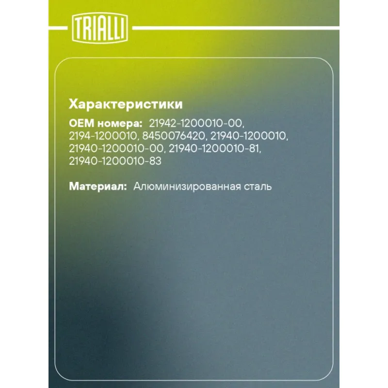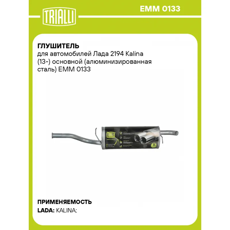 Глушитель для автомобилей Лада 2194 Kalina (13-) основной (алюминизированная сталь) Характеристики: Артикул: EMM 0133 OEM номера: 21942-1200010-00, 2194-1200010, 8450076420, 21940-1200010, 21940-1200010-00, 21940-1200010-81, 21940-1200010-83 Количество на автомобиль: 1 Камеры корпуса: 3 Материал: Алюминизированная сталь Гарантийный срок: 2 года/60 тыс. Особенности конструкции:: Шумопоглощающая набивка E-GLASS Длина изделия (мм): 1200 Длина корпуса камеры (мм): 540 Форма изделия: Овал Диаметр перфор. трубы (мм): 45 Диаметр корпуса D-1 (мм): 221 Диаметр корпуса D-2 (мм): 131 Товарная линейка: BLACK Дополнительная информация: Этикетка изделия может отличаться от представленной на фото Комплектация: Глушитель основной - 1 шт Гарантия: от 1 года.