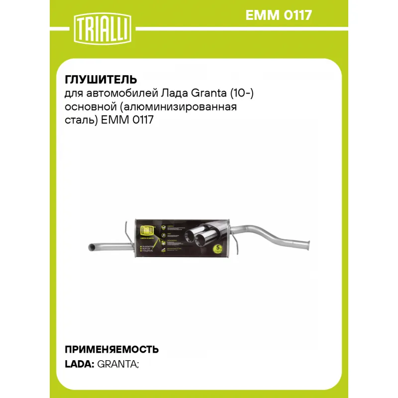 Глушитель для автомобилей Лада Granta (10-) основной (алюминизированная сталь) Характеристики: Артикул: EMM 0117 OEM номера: 21900120001000 Количество на автомобиль: 1 Камеры корпуса: 3 Материал: Алюминизированная сталь Гарантийный срок: 2 года/60 тыс. Особенности конструкции:: Шумопоглощающая набивка E-GLASS Длина изделия (мм): 1278 Длина корпуса камеры (мм): 540 Форма изделия: Овал Диаметр перфор. трубы (мм): 45 Диаметр корпуса D-1 (мм): 221 Диаметр корпуса D-2 (мм): 131 Товарная линейка: BLACK Дополнительная информация: Этикетка изделия может отличаться от представленной на фото Сопутствующий товар: Глушители основные/глушители дополнительные (резонаторы): EAM 1202, EAM 0122 Комплектация: Глушитель основной - 1 шт Гарантия: от 1 года.