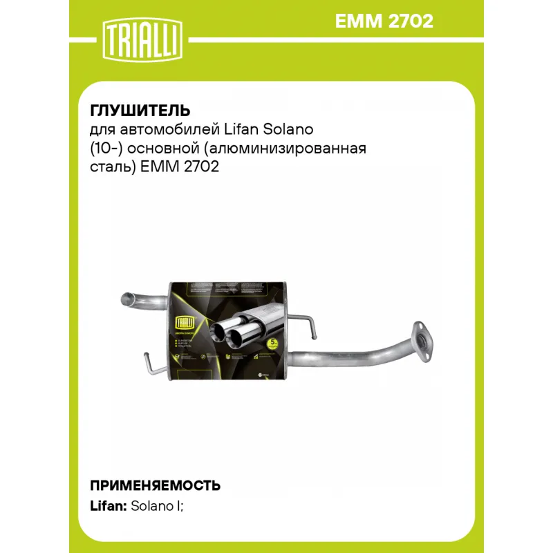 Глушитель для автомобилей Lifan Solano (10-) основной (алюминизированная сталь) Характеристики: Артикул: EMM 2702 OEM номера: B1201200 Количество на автомобиль: 1 Камеры корпуса: 3 Материал: Алюминизированная сталь Гарантийный срок: 2 года/60 тыс. Особенности конструкции:: Шумопоглощающая набивка E-GLASS Длина изделия (мм): 1090 Длина корпуса камеры (мм): 500 Форма изделия: Овал Диаметр перфор. трубы (мм): 51 Диаметр корпуса D-1 (мм): 280 Диаметр корпуса D-2 (мм): 165 Товарная линейка: BLACK Дополнительная информация: Этикетка изделия может отличаться от представленной на фото Сопутствующий товар: Глушители основные/глушители дополнительные (резонаторы): EAM 2720 Подходит для авто: Lifan Solano I (10-) Для проверки применяемости отправьте VIN автомобиля через вкладку "Есть вопросы о товаре?" Комплектация: Глушитель основной - 1 шт Гарантия: от 1 года.
