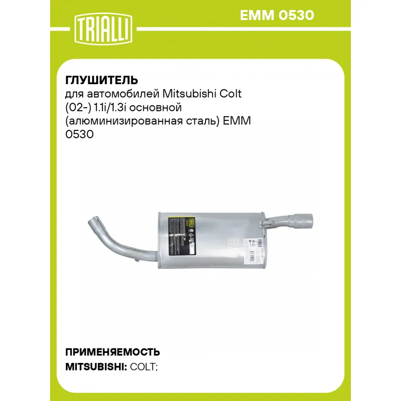 Глушитель для автомобилей Mitsubishi Colt (02-) 1.1i/1.3i основной (алюминизированная сталь) Характеристики: Артикул: EMM 0530 OEM номера: 1571A616, 1571A790, MR968906 Особенности конструкции:: Шумопоглощающая набивка E-GLASS Гарантийный срок: 2 года/60 тыс. Количество на автомобиль: 1 Камеры корпуса: 3 Материал: Алюминизированная сталь Длина изделия (мм): 745 Длина корпуса камеры (мм): 410 Форма изделия: Овал Диаметр перфор. трубы (мм): 45 Диаметр корпуса D-1 (мм): 221 Диаметр корпуса D-2 (мм): 131 Товарная линейка: BLACK Дополнительная информация: Этикетка изделия может отличаться от представленной на фото Комплектация: Глушитель основной - 1 шт Гарантия: от 1 года.