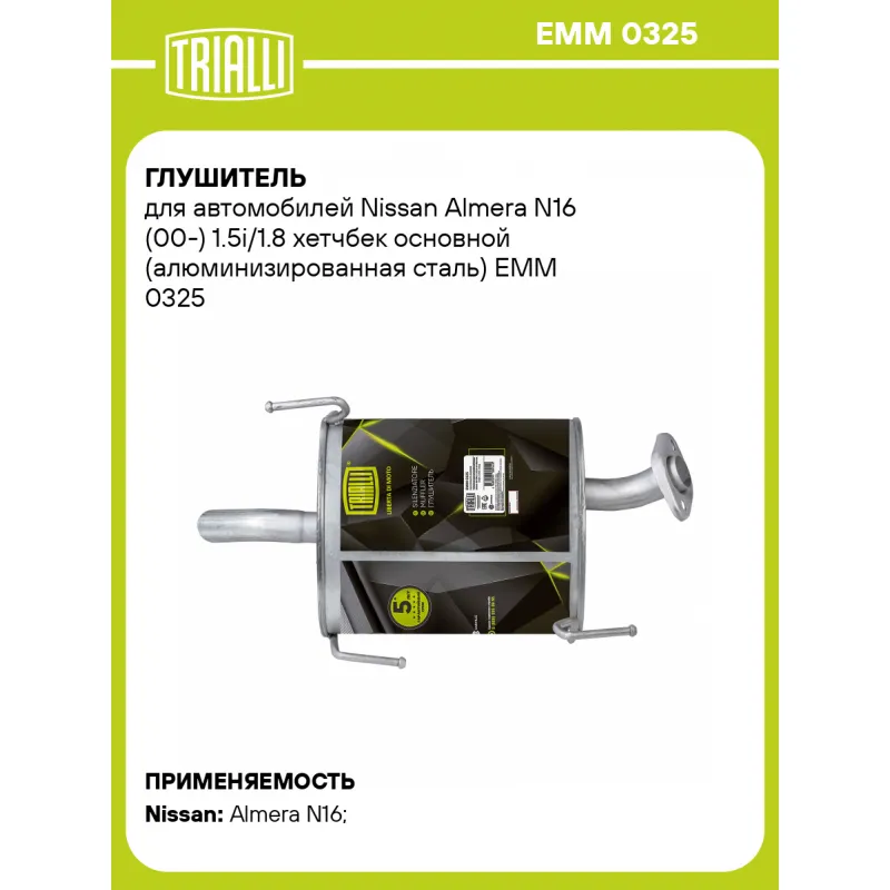 Глушитель для автомобилей Nissan Almera N16 (00-) 1.5i/1.8 хетчбек основной (алюминизированная сталь) Характеристики: Артикул: EMM 0325 OEM номера: 201005M370, 20100BM500, 20100BM500KE, 20100BM505, 201005M370KE Количество на автомобиль: 1 Камеры корпуса: 3 Материал: Алюминизированная сталь Гарантийный срок: 2 года/60 тыс. Особенности конструкции:: Шумопоглощающая набивка E-GLASS Длина изделия (мм): 590 Длина корпуса камеры (мм): 330 Форма изделия: Овал Диаметр перфор. трубы (мм): 43 Диаметр корпуса D-1 (мм): 280 Диаметр корпуса D-2 (мм): 165 Товарная линейка: BLACK Дополнительная информация: Этикетка изделия может отличаться от представленной на фото Сопутствующий товар: Трубы газоприемные: ERP 0720 Подходит для авто: Nissan Almera N16 (00-) Для проверки применяемости отправьте VIN автомобиля через вкладку "Есть вопросы о товаре?" Комплектация: Глушитель основной - 1 шт Гарантия: от 1 года.