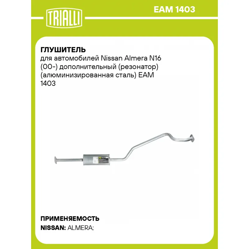Глушитель для автомобилей Nissan Almera N16 (00-) дополнительный (резонатор) (алюминизированная сталь) Характеристики: Артикул: EAM 1403 OEM номера: 20300BN800 Количество на автомобиль: 1 Камеры корпуса: 3 Материал: Алюминизированная сталь Гарантийный срок: 2 года/60 тыс. Особенности конструкции:: Шумопоглощающая набивка E-GLASS Длина изделия (мм): 2040 Длина корпуса камеры (мм): 400 Форма изделия: Овал Диаметр перфор. трубы (мм): 45 Диаметр корпуса D-1 (мм): 171 Диаметр корпуса D-2 (мм): 97 Товарная линейка: BLACK Дополнительная информация: Этикетка изделия может отличаться от представленной на фото Сопутствующий товар: Глушители основные/глушители дополнительные (резонаторы): EMM 1401 Сопутствующий товар: Трубы газоприемные: ERP 0720 Комплектация: Резонатор - 1 шт Гарантия: от 1 года.