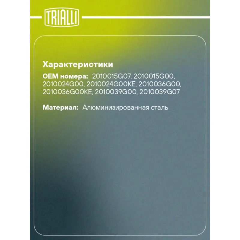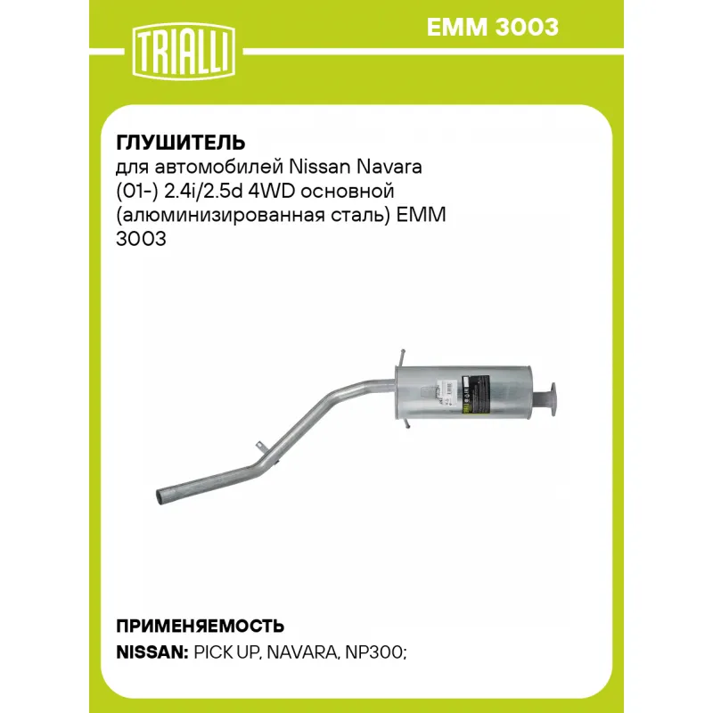 Глушитель для автомобилей Nissan Navara (01-) 2.4i/2.5d 4WD основной (алюминизированная сталь) Характеристики: Артикул: EMM 3003 OEM номера: 2010015G07, 2010015G00, 2010024G00, 2010024G00KE, 2010036G00, 2010036G00KE, 2010039G00, 2010039G07 Особенности конструкции:: Шумопоглощающая набивка E-Glass Гарантийный срок: 2 года/60 тыс. Количество на автомобиль: 1 Камеры корпуса: 3 Материал: Алюминизированная сталь Длина изделия (мм): 1470 Длина корпуса камеры (мм): 500 Форма изделия: Овал Диаметр перфор. трубы (мм): 51 Диаметр корпуса D-1 (мм): 200 Диаметр корпуса D-2 (мм): 170 Товарная линейка: BLACK Дополнительная информация: Этикетка изделия может отличаться от представленной на фото Комплектация: Глушитель основной - 1 шт Гарантия: от 1 года.