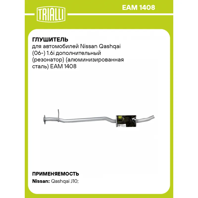Глушитель для автомобилей Nissan Qashqai (06-) 1.6i дополнительный (резонатор) (алюминизированная сталь) Характеристики: Артикул: EAM 1408 OEM номера: 20100JD00A Количество на автомобиль: 1 Камеры корпуса: 3 Материал: Алюминизированная сталь Гарантийный срок: 2 года/60 тыс. Особенности конструкции:: Шумопоглощающая набивка E-GLASS Длина изделия (мм): 1590 Длина корпуса камеры (мм): 290 Форма изделия: Овал Диаметр перфор. трубы (мм): 51 Диаметр корпуса D-1 (мм): 171 Диаметр корпуса D-2 (мм): 97 Товарная линейка: BLACK Дополнительная информация: Этикетка изделия может отличаться от представленной на фото Сопутствующий товар: Глушители основные/глушители дополнительные (резонаторы): EMM 1407 Подходит для авто: Nissan Qashqai J10 (06-) Для проверки применяемости отправьте VIN автомобиля через вкладку "Есть вопросы о товаре?" Комплектация: Резонатор - 1 шт Гарантия: от 1 года.