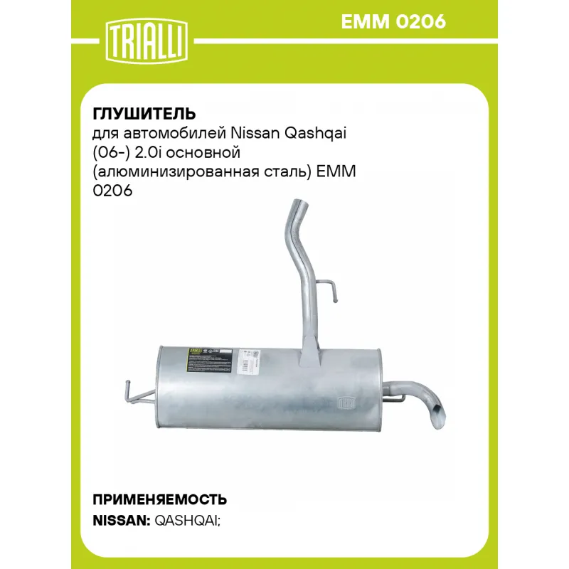 Глушитель для автомобилей Nissan Qashqai (06-) 2.0i основной (алюминизированная сталь) Характеристики: Артикул: EMM 0206 OEM номера: 20100JD200, 20100JD21A, 20100BR20A Особенности конструкции:: Шумопоглощающая набивка E-GLASS Гарантийный срок: 2 года/60 тыс. Количество на автомобиль: 1 Камеры корпуса: 4 Материал: Алюминизированная сталь Длина изделия (мм): 1110 Длина корпуса камеры (мм): 753 Форма изделия: Овал Диаметр корпуса D-1 (мм): 280 Диаметр корпуса D-2 (мм): 165 Товарная линейка: BLACK Дополнительная информация: Этикетка изделия может отличаться от представленной на фото Сопутствующий товар: Глушители основные/глушители дополнительные (резонаторы): EAM 0368 Комплектация: Глушитель основной - 1 шт Гарантия: от 1 года.