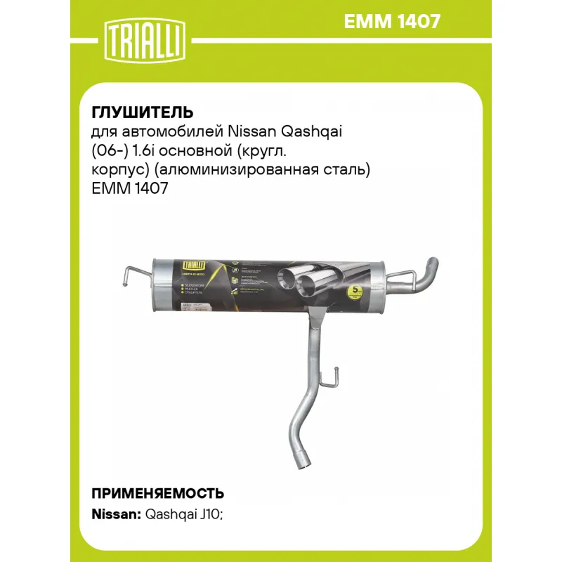 Глушитель для автомобилей Nissan Qashqai (06-) 1.6i основной (кругл. корпус) (алюминизированная сталь) Характеристики: Артикул: EMM 1407 OEM номера: 20100JD00A Количество на автомобиль: 1 Камеры корпуса: 3 Материал: Алюминизированная сталь Гарантийный срок: 2 года/60 тыс. Особенности конструкции:: Шумопоглощающая набивка E-GLASS Длина изделия (мм): 1100 Длина корпуса камеры (мм): 800 Форма изделия: Круг Диаметр перфор. трубы (мм): 51 Диаметр корпуса D-1 (мм): 190 Товарная линейка: BLACK Дополнительная информация: Этикетка изделия может отличаться от представленной на фото Сопутствующий товар: Глушители основные/глушители дополнительные (резонаторы): EAM 1408 Подходит для авто: Nissan Qashqai J10 (06-) Для проверки применяемости отправьте VIN автомобиля через вкладку "Есть вопросы о товаре?" Комплектация: Глушитель основной - 1 шт Гарантия: от 1 года.