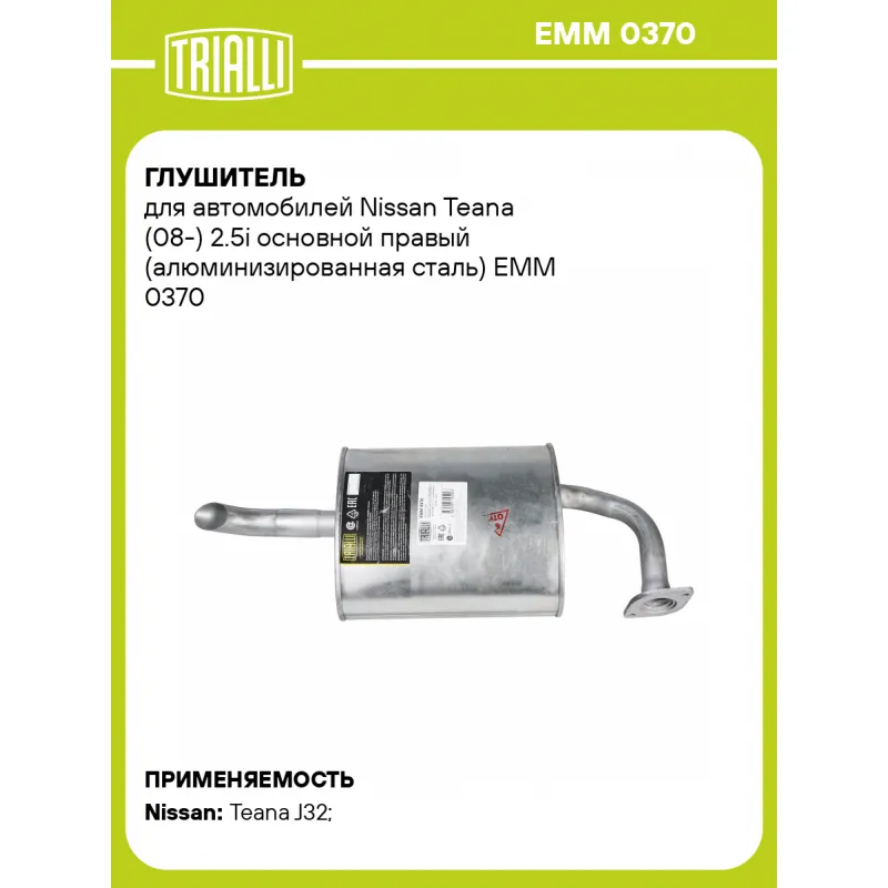 Глушитель для автомобилей Nissan Teana (08-) 2.5i основной правый (алюминизированная сталь) Характеристики: Артикул: EMM 0370 OEM номера: 20100JN20B Парный товар: EMM 0369 Количество на автомобиль: 1 Камеры корпуса: 3 Материал: Алюминизированная сталь Гарантийный срок: 2 года/60 тыс. Особенности конструкции:: Шумопоглощающая набивка E-GLASS Длина изделия (мм): 670 Длина корпуса камеры (мм): 330 Форма изделия: Овал Диаметр перфор. трубы (мм): 45 Диаметр корпуса D-1 (мм): 280 Диаметр корпуса D-2 (мм): 165 Товарная линейка: BLACK Дополнительная информация: Этикетка изделия может отличаться от представленной на фото Сопутствующий товар: Глушители основные/глушители дополнительные (резонаторы): EAM 0375, EMM 0369 Подходит для авто: Nissan Teana J32 (08-) Для проверки применяемости отправьте VIN автомобиля через вкладку "Есть вопросы о товаре?" Комплектация: Глушитель основной - 1 шт Гарантия: от 1 года.