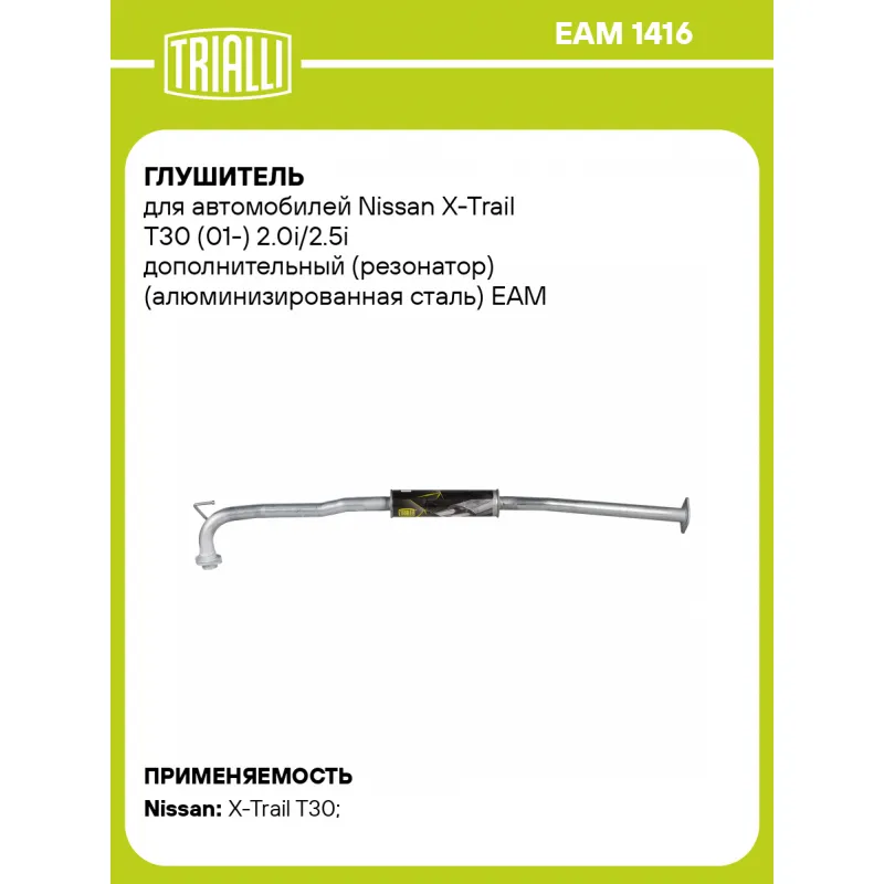 Глушитель для автомобилей Nissan X-Trail T30 (01-) 2.0i/2.5i дополнительный (резонатор) (алюминизированная сталь) Характеристики: Артикул: EAM 1416 OEM номера: 203008H31A, 203008h300, 203008H310 Количество на автомобиль: 1 Камеры корпуса: 1 Материал: Алюминизированная сталь Гарантийный срок: 2 года/60 тыс. Особенности конструкции:: Шумопоглощающая набивка E-GLASS Длина изделия (мм): 1740 Длина корпуса камеры (мм): 381 Форма изделия: Круг Диаметр перфор. трубы (мм): 51 Диаметр корпуса D-1 (мм): 101 Товарная линейка: BLACK Дополнительная информация: Этикетка изделия может отличаться от представленной на фото Сопутствующий товар: Глушители основные/глушители дополнительные (резонаторы): EMM 1416 Сопутствующий товар: Трубы газоприемные: ERP 2020 Подходит для авто: Nissan X-Trail T30 (01-) Для проверки применяемости отправьте VIN автомобиля через вкладку "Есть вопросы о товаре?" Комплектация: Резонатор - 1 шт Гарантия: от 1 года.