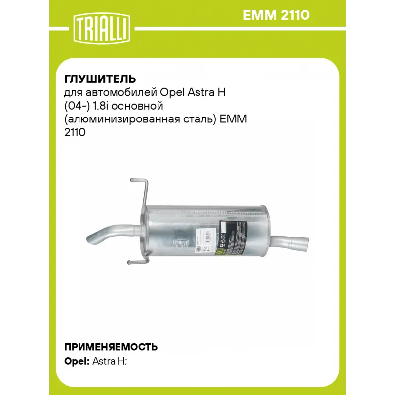 Глушитель для автомобилей Opel Astra H (04-) 1.8i основной (алюминизированная сталь) Характеристики: Артикул: EMM 2110 OEM номера: 5852303, 13145223 Количество на автомобиль: 1 Камеры корпуса: 3 Материал: Алюминизированная сталь Гарантийный срок: 2 года/60 тыс. Особенности конструкции:: Шумопоглощающая набивка E-GLASS Длина изделия (мм): 755 Длина корпуса камеры (мм): 434 Форма изделия: Круг Диаметр перфор. трубы (мм): 45 Диаметр корпуса D-1 (мм): 190 Товарная линейка: BLACK Дополнительная информация: Этикетка изделия может отличаться от представленной на фото Сопутствующий товар: Глушители основные/глушители дополнительные (резонаторы): EAM 2106, EAM 2110 Сопутствующий товар: Трубы газоприемные: ERP 2101, ERP 1607 Подходит для авто: Opel Astra H (04-) Для проверки применяемости отправьте VIN автомобиля через вкладку "Есть вопросы о товаре?" Комплектация: Глушитель основной - 1 шт Гарантия: от 1 года.