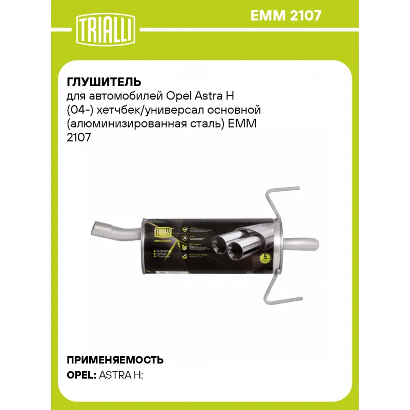Глушитель для автомобилей Opel Astra H (04-) хетчбек/универсал основной (алюминизированная сталь) Характеристики: Артикул: EMM 2107 OEM номера: 5852307, 13158999 Количество на автомобиль: 1 Камеры корпуса: 3 Материал: Алюминизированная сталь Гарантийный срок: 2 года/60 тыс. Особенности конструкции:: Шумопоглощающая набивка E-GLASS Длина изделия (мм): 755 Длина корпуса камеры (мм): 455 Форма изделия: Круг Диаметр перфор. трубы (мм): 43 Диаметр корпуса D-1 (мм): 190 Товарная линейка: BLACK Дополнительная информация: Этикетка изделия может отличаться от представленной на фото Сопутствующий товар: Трубы газоприемные: ERP 1607 Комплектация: Глушитель основной - 1 шт Гарантия: от 1 года.