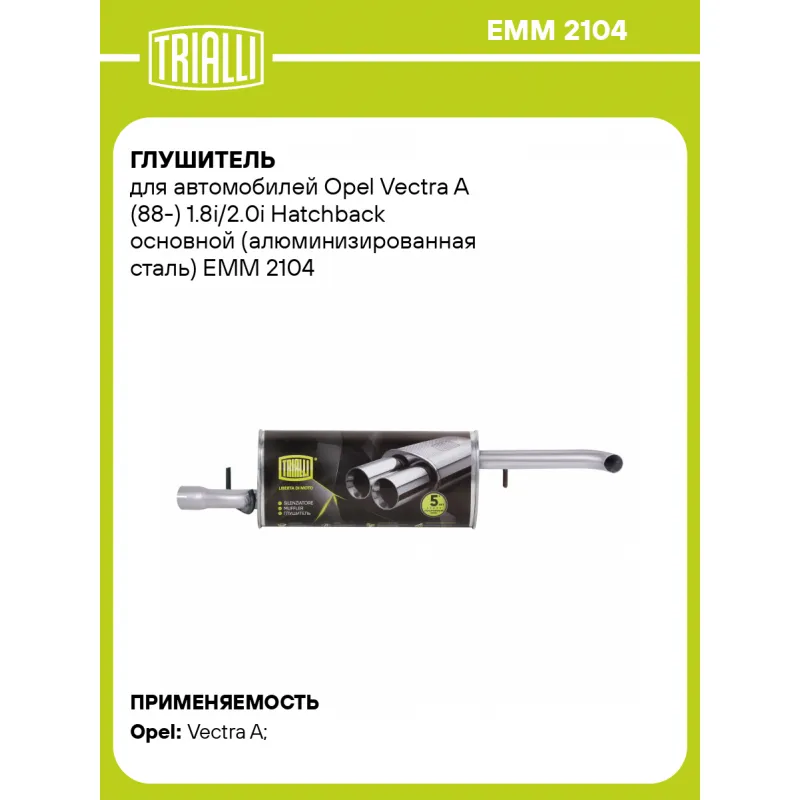Глушитель для автомобилей Opel Vectra A (88-) 1.8i/2.0i Hatchback основной (алюминизированная сталь) Характеристики: Артикул: EMM 2104 OEM номера: 852884, 90280502, 90349968, 90399170, 852356 Количество на автомобиль: 1 Камеры корпуса: 3 Материал: Алюминизированная сталь Гарантийный срок: 2 года/60 тыс. Особенности конструкции:: Шумопоглощающая набивка E-GLASS Длина изделия (мм): 995 Длина корпуса камеры (мм): 485 Форма изделия: Овал Диаметр перфор. трубы (мм): 45 Диаметр корпуса D-1 (мм): 221 Диаметр корпуса D-2 (мм): 131 Товарная линейка: BLACK Дополнительная информация: Этикетка изделия может отличаться от представленной на фото Подходит для авто: Opel Vectra A (88-) Для проверки применяемости отправьте VIN автомобиля через вкладку "Есть вопросы о товаре?" Комплектация: Глушитель основной - 1 шт Гарантия: от 1 года.