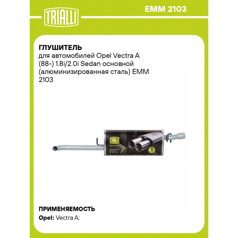 Глушитель для автомобилей Opel Vectra A (88-) 1.8i/2.0i Sedan основной (алюминизированная сталь) Характеристики: Артикул: EMM 2103 OEM номера: 852355, 852883, 90280256, 90349967, 90399169 Количество на автомобиль: 1 Камеры корпуса: 3 Материал: Алюминизированная сталь Гарантийный срок: 2 года/60 тыс. Особенности конструкции:: Шумопоглощающая набивка E-GLASS Длина изделия (мм): 1105 Длина корпуса камеры (мм): 485 Форма изделия: Овал Диаметр перфор. трубы (мм): 45 Диаметр корпуса D-1 (мм): 221 Диаметр корпуса D-2 (мм): 131 Товарная линейка: BLACK Дополнительная информация: Этикетка изделия может отличаться от представленной на фото Подходит для авто: Opel Vectra A (88-) Для проверки применяемости отправьте VIN автомобиля через вкладку "Есть вопросы о товаре?" Комплектация: Глушитель основной - 1 шт Гарантия: от 1 года.
