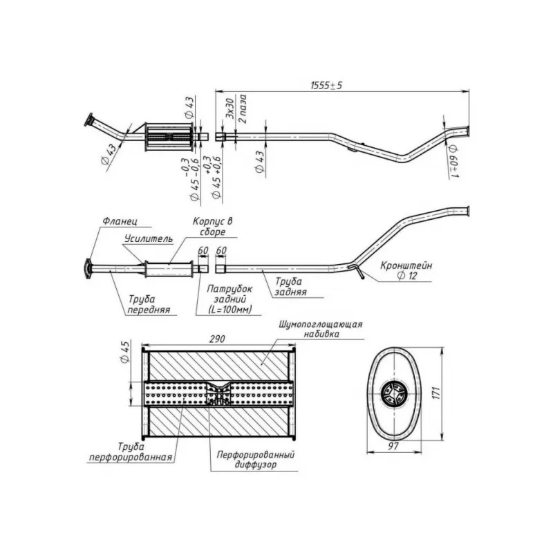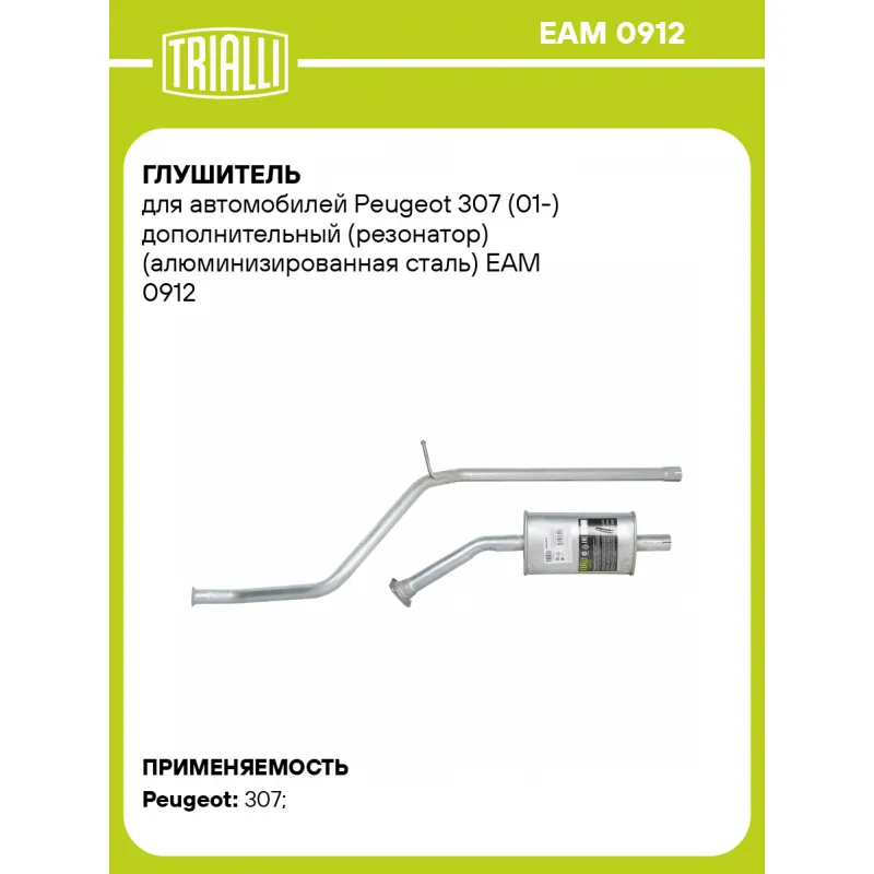 Глушитель для автомобилей Peugeot 307 (01-) дополнительный (резонатор) (алюминизированная сталь) Характеристики: Артикул: EAM 0912 OEM номера: 1717R3, 1717Z1, 1717AK Количество на автомобиль: 1 Камеры корпуса: 3 Материал: Алюминизированная сталь Гарантийный срок: 2 года/60 тыс. Особенности конструкции:: Шумопоглощающая набивка E-GLASS Длина изделия (мм): 2246 Длина корпуса камеры (мм): 290 Форма изделия: Овал Диаметр перфор. трубы (мм): 45 Диаметр корпуса D-1 (мм): 171 Диаметр корпуса D-2 (мм): 97 Товарная линейка: BLACK Дополнительная информация: Этикетка изделия может отличаться от представленной на фото Подходит для авто: Peugeot 307 (00-) Для проверки применяемости отправьте VIN автомобиля через вкладку "Есть вопросы о товаре?" Комплектация: Резонатор - 1 шт Гарантия: от 1 года.