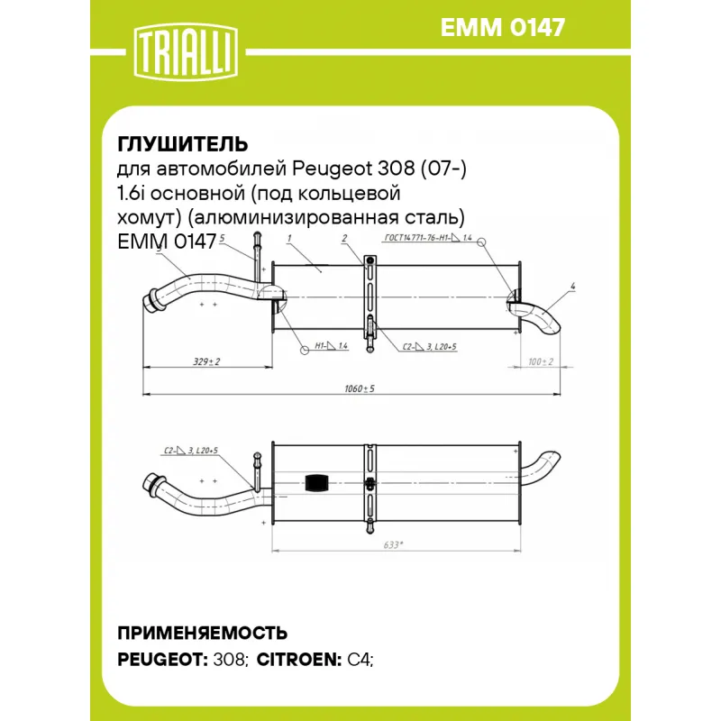 Глушитель для автомобилей Peugeot 308 (07-) 1.6i основной (под кольцевой хомут) (алюминизированная сталь) Характеристики: Артикул: EMM 0147 OEM номера: 1730S2 Особенности конструкции:: Шумопоглощающая набивка E-Glass Гарантийный срок: 2 года/60 тыс. Количество на автомобиль: 1 Камеры корпуса: 3 Материал: Алюминизированная сталь Длина изделия (мм): 1060 Длина корпуса камеры (мм): 633 Форма изделия: Овал Диаметр перфор. трубы (мм): 45 Диаметр корпуса D-1 (мм): 205 Диаметр корпуса D-2 (мм): 175 Товарная линейка: BLACK Дополнительная информация: Этикетка изделия может отличаться от представленной на фото Комплектация: Глушитель основной - 1 шт Гарантия: от 1 года.