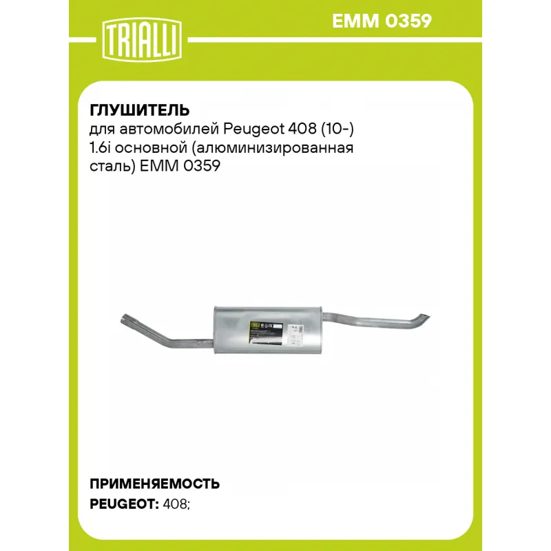 Глушитель для автомобилей Peugeot 408 (10-) 1.6i основной (алюминизированная сталь) Характеристики: Артикул: EMM 0359 OEM номера: 1607953980 Особенности конструкции:: Шумопоглощающая набивка E-GLASS Гарантийный срок: 2 года/60 тыс. Количество на автомобиль: 1 Камеры корпуса: 3 Материал: Алюминизированная сталь Длина изделия (мм): 1395 Длина корпуса камеры (мм): 489 Форма изделия: Овал Диаметр перфор. трубы (мм): 45 Диаметр корпуса D-1 (мм): 226 Диаметр корпуса D-2 (мм): 137 Товарная линейка: BLACK Дополнительная информация: Этикетка изделия может отличаться от представленной на фото Сопутствующий товар: Глушители основные/глушители дополнительные (резонаторы): EAM 0359 Комплектация: Глушитель основной - 1 шт Гарантия: от 1 года.