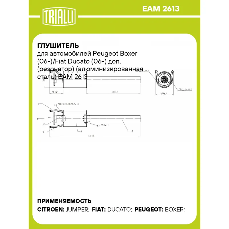 Глушитель для автомобилей Peugeot Boxer (06-)/Fiat Ducato (06-) доп. (резонатор) (алюминизированная сталь) Характеристики: Артикул: EAM 2613 OEM номера: 1717.KR, 1717LW, 1717JW, 1606237780, 1606238180, 1608328280 Особенности конструкции:: Шумопоглощающая набивка E-GLASS Гарантийный срок: 2 года/60 тыс. Количество на автомобиль: 1 Камеры корпуса: 3 Материал: Алюминизированная сталь Длина изделия (мм): 778 Длина корпуса камеры (мм): 200 Форма изделия: Круг Диаметр перфор. трубы (мм): 63 Диаметр корпуса D-1 (мм): 138 Товарная линейка: BLACK Дополнительная информация: Этикетка изделия может отличаться от представленной на фото Комплектация: Резонатор - 1 шт Гарантия: от 1 года.