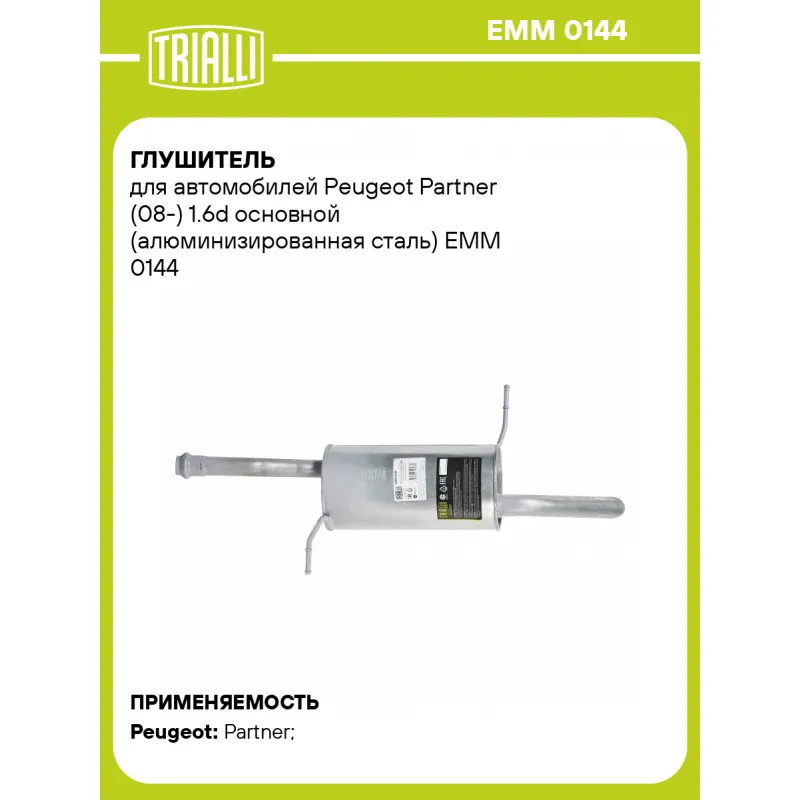Глушитель для автомобилей Peugeot Partner (08-) 1.6d основной (алюминизированная сталь) Характеристики: Артикул: EMM 0144 OEM номера: 1730.Y0 Количество на автомобиль: 1 Камеры корпуса: 3 Материал: Алюминизированная сталь Гарантийный срок: 2 года/60 тыс. Особенности конструкции:: Шумопоглощающая набивка E-GLASS Длина изделия (мм): 1040 Длина корпуса камеры (мм): 400 Форма изделия: Овал Диаметр перфор. трубы (мм): 45-51 Диаметр корпуса D-1 (мм): 195 Диаметр корпуса D-2 (мм): 165 Товарная линейка: BLACK Дополнительная информация: Этикетка изделия может отличаться от представленной на фото Сопутствующий товар: Трубы газоприемные: ECP 0344 Подходит для авто: Peugeot Partner (08-) Для проверки применяемости отправьте VIN автомобиля через вкладку "Есть вопросы о товаре?" Комплектация: Глушитель основной - 1 шт Гарантия: от 1 года.