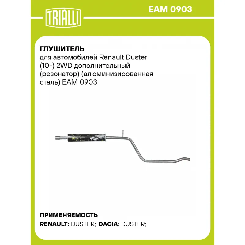Глушитель для автомобилей Renault Duster (10-) 2WD дополнительный (резонатор) (алюминизированная сталь) Характеристики: Артикул: EAM 0903 OEM номера: 200109451R, 200103237R Количество на автомобиль: 1 Камеры корпуса: 3 Материал: Алюминизированная сталь Гарантийный срок: 2 года/60 тыс. Особенности конструкции:: Шумопоглощающая набивка E-GLASS Длина изделия (мм): 1865 Длина корпуса камеры (мм): 540 Форма изделия: Овал Диаметр перфор. трубы (мм): 45 Диаметр корпуса D-1 (мм): 120 Диаметр корпуса D-2 (мм): 87 Товарная линейка: BLACK Дополнительная информация: Этикетка изделия может отличаться от представленной на фото Сопутствующий товар: Глушители основные/глушители дополнительные (резонаторы): EMM 0903 Комплектация: Резонатор - 1 шт Гарантия: от 1 года.