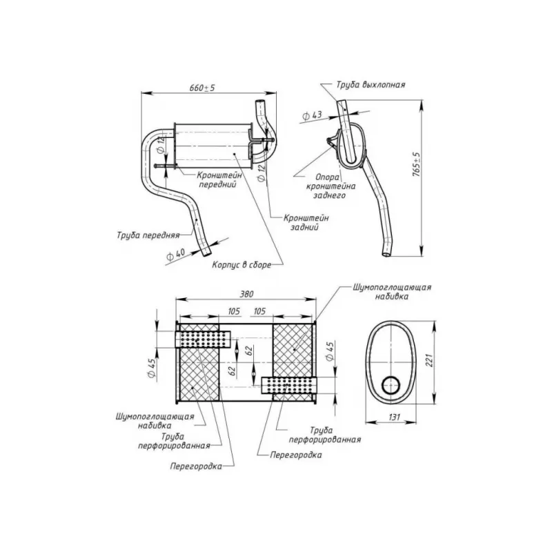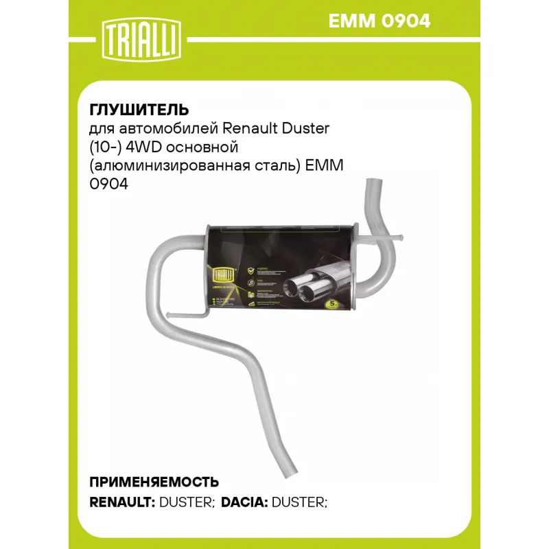 Глушитель для автомобилей Renault Duster (10-) 4WD основной (алюминизированная сталь) Характеристики: Артикул: EMM 0904 OEM номера: 200107364R, 200108448R Количество на автомобиль: 1 Камеры корпуса: 3 Материал: Алюминизированная сталь Гарантийный срок: 2 года/60 тыс. Особенности конструкции:: Шумопоглощающая набивка E-GLASS Длина изделия (мм): 660 Длина корпуса камеры (мм): 380 Форма изделия: Овал Диаметр перфор. трубы (мм): 45 Диаметр корпуса D-1 (мм): 221 Диаметр корпуса D-2 (мм): 131 Товарная линейка: BLACK Дополнительная информация: Этикетка изделия может отличаться от представленной на фото Сопутствующий товар: Глушители основные/глушители дополнительные (резонаторы): EAM 0904 Комплектация: Глушитель основной - 1 шт Гарантия: от 1 года.