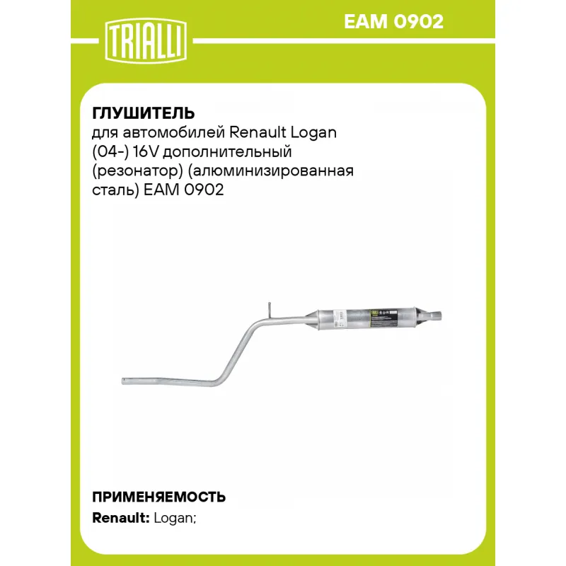 Глушитель для автомобилей Renault Logan (04-) 16V дополнительный (резонатор) (алюминизированная сталь) Характеристики: Артикул: EAM 0902 OEM номера: 6001549295 Количество на автомобиль: 1 Камеры корпуса: 3 Материал: Алюминизированная сталь Гарантийный срок: 2 года/60 тыс. Особенности конструкции:: Шумопоглощающая набивка E-GLASS Длина изделия (мм): 1849 Длина корпуса камеры (мм): 540 Форма изделия: Овал Диаметр перфор. трубы (мм): 45 Диаметр корпуса D-1 (мм): 120 Диаметр корпуса D-2 (мм): 87 Товарная линейка: BLACK Дополнительная информация: Этикетка изделия может отличаться от представленной на фото Подходит для авто: Renault Logan (04-) Для проверки применяемости отправьте VIN автомобиля через вкладку "Есть вопросы о товаре?" Комплектация: Резонатор - 1 шт Гарантия: от 1 года.